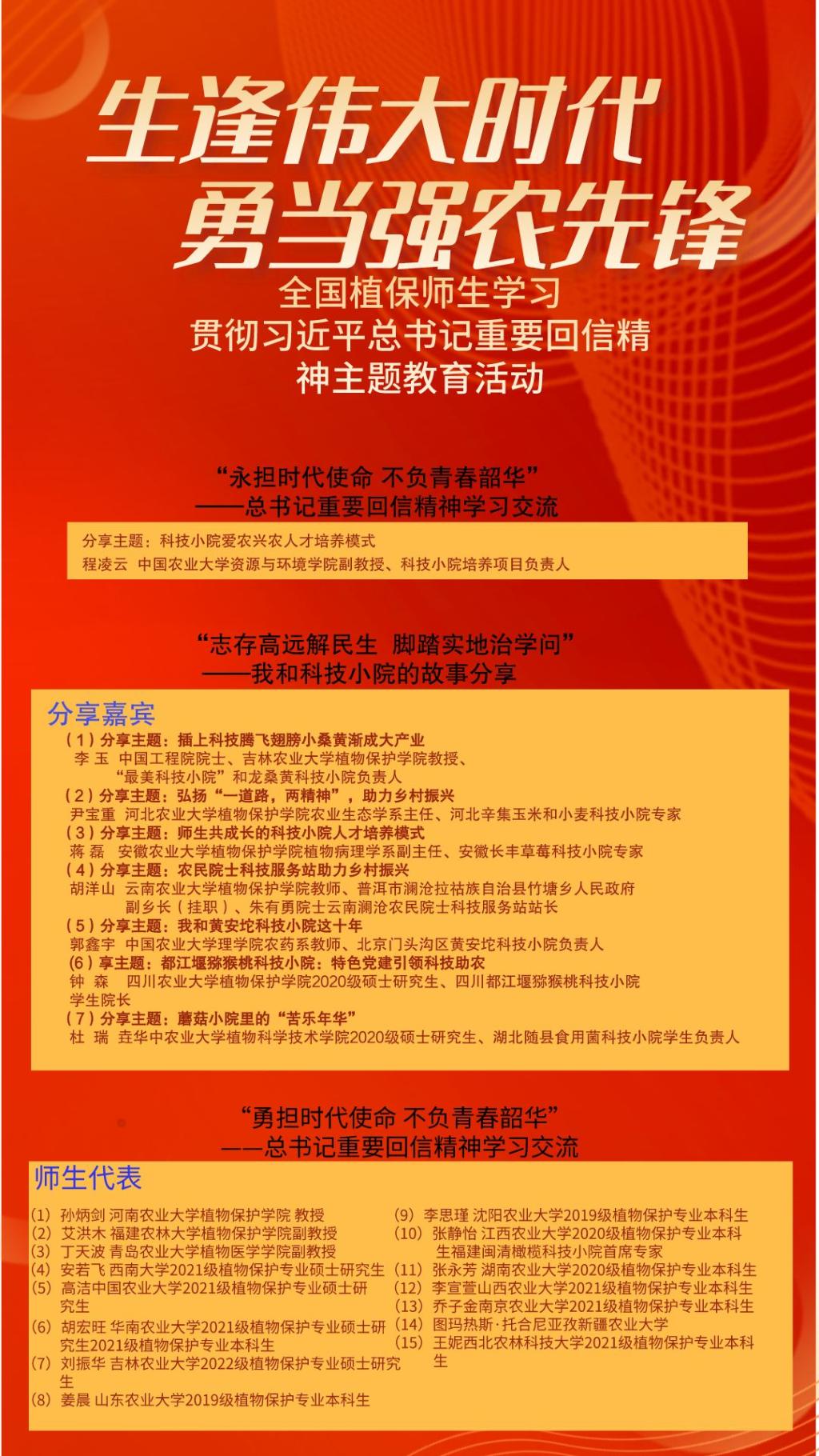 为深入学习领会习近平总书记重要回信精神,厚植爱农情怀,练就兴农本领,5月7日晚,公司师生代表于南教624、625教室在线上参加了“生逢伟大时代,勇当强农先锋”全国植保师生学习贯彻习近平总书记重要回信精神主题教育活动。公司党委书记靳国斌、副经理杨忠仁出席活动。