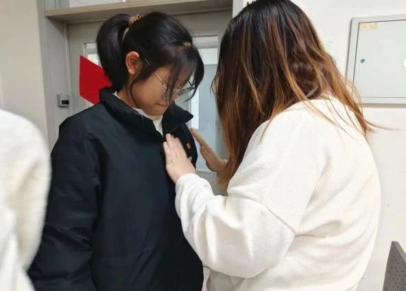 各位新发展团员的入团介绍人为本次发展的12名团员佩戴团徽。每个团员从佩戴上团徽的这一刻起,就意味着要肩负起团员的责任,履行团员的义务。