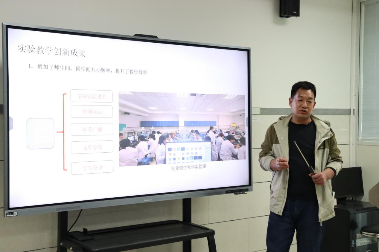 随后,比赛正式开始。参赛教师们依次走上讲台,带来了一场场精彩纷呈的教学展示。东保柱老师带来《农业微生物学》实验课教学创新成果报告,他打破传统实验教学模式,通过引入显微互动教学系统,促进了老师与员工间的沟通,也提高了教学效率。