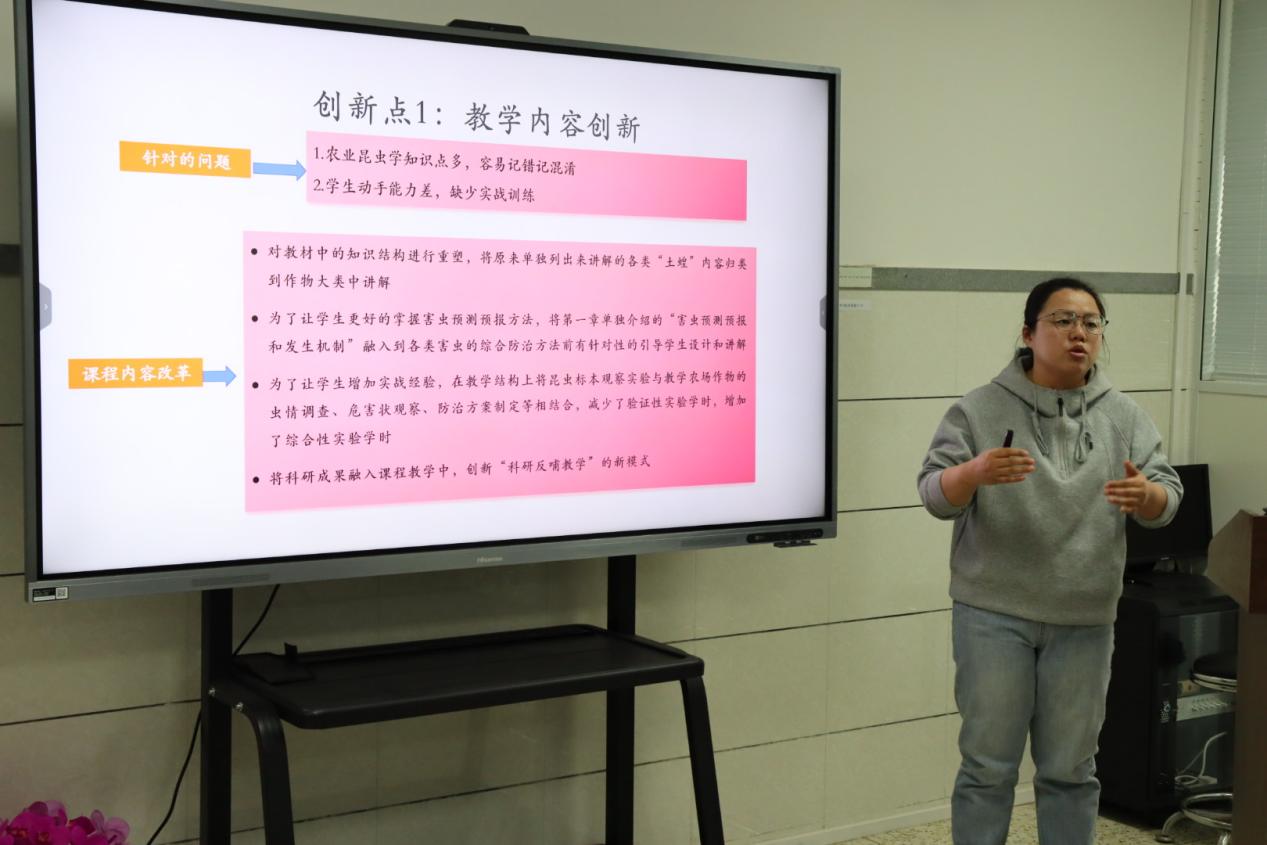 李艳艳老师进行《农业昆虫学》教学设计创新汇报,她总结了同学们在学习中可能会遇到的问题,并一一提出了解决方案。还通过引入小组合作、观看视频等手段让同学们能够更好地融入课堂。另外,李老师还将思政教育与课程进行融合,极大地激发了员工的学习兴趣。