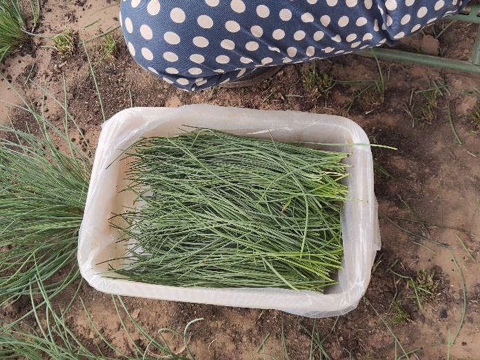 在调研现场,发现今年春季气温波动较大,导致部分露地沙葱出现生长迟缓现象。