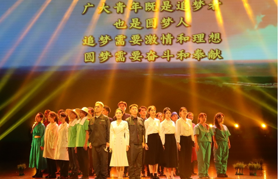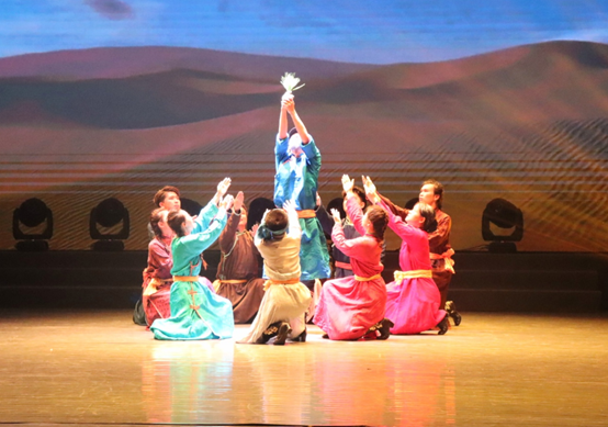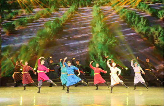 作品创新突破传统理论宣讲形式,巧妙融合情景舞蹈。十余名舞者通过充满张力的肢体动作,生动再现风沙肆虐的严峻挑战;又以舒展柔美的舞姿,细腻描绘梭梭林蓬勃蔓延的盎然绿意。这种“讲述+舞蹈”的双重叙事手法相得益彰,将苏和老人的感人事迹艺术化地呈现在观众面前,深刻彰显了新时代青年勇担使命的精神品格。