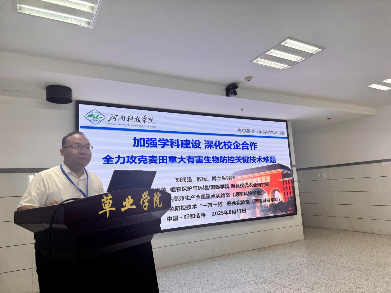为深化植物保护学科领域的交流合作,推动跨区域植保技术创新融合,助力现代农业高质量发展,由公司主办的 “粤琼豫蒙植保学科学术研讨会” 于 2025 年 8 月 16 日 - 18 日在呼和浩特市成功举办,会议由来自海南大学、华南农业大学、中国农业大学、南京农业大学、中国科公司微生物研究所、中国农业科公司植保所、中国质量检验检测科学研究院、北京农林科公司、北京化工大学、扬州大学、湖北大学、河南科技公司、重庆三峡公司、拜耳集团等单位的30余名专家学者及公司植物保护学科教师共同参加。本次研讨会以 “‘南繁北护’跨区域植保技术融合,助力现代农业高质量发展” 为主题,聚焦南北地区气候差异、作物布局特点下的病虫害绿色防控、生物防治技术创新、植保资源共享利用等核心议题,搭建了跨区域的学术交流平台。