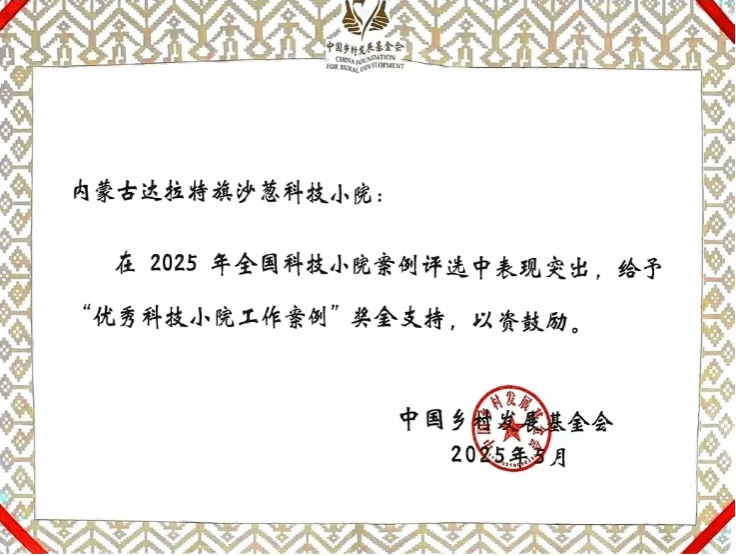 公司牵头建设的内蒙古达拉特旗沙葱小院成功入选“科技小院典型工作案例”,作为全国1800余个科技小院中脱颖而出的50个优秀案例之一接受表彰。成为公司唯一获此殊荣的科技小院。这一荣誉不仅是对沙葱科技小院建设、工作和发展的肯定,更为科技小院赋能乡村振兴战略提供了可借鉴的实践经验。团队通过深入田间地头开展科学研究和产业服务,不断探索农业绿色发展新模式,为荒漠干旱区经济带农业实现绿色、可持续发展提供了有力支撑。未来,沙葱小院将继续秉持“科技助农、教育兴农”的理念,充分发挥科技小院的示范引领作用,扎根乡村,服务基层,为实现农业农村现代化和全面推进乡村振兴贡献更多智慧与力量。