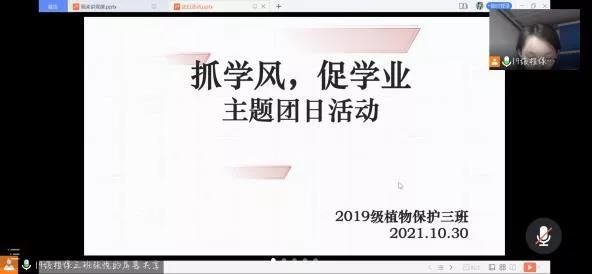 “疫”考当前,为培育优良学风,营造严谨踏实的学习氛围,督促同学们做好备考。公司19级植物保护三班于10月30日晚采用线上会议开展本次团日活动,班级所有成员全部参加。