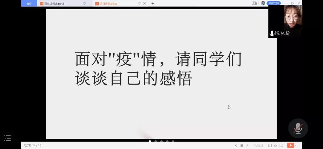 活动伊始,张悦同学为大家介绍了当前疫情防控最新消息,在情况如此严峻的状况下,她呼吁大家应该在思想上高度重视,有特殊情况及时上报,保持积极乐观的心态,积极配合公司完成各类统计。接着,关于近两周上网课的情况,张悦同学提醒大家应该端正网课的学习态度,杜绝边学边玩的现象发生。