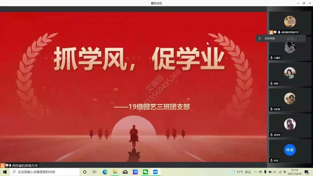 为养成优良学风,规范学习纪律,促进学业进步,19园艺三班于10月30日晚19:00在腾讯会议线上开展了“抓学风,促学业”主题团日活动。本次团日活动由组织委员龚殊璇主持,班级所有成员参加。