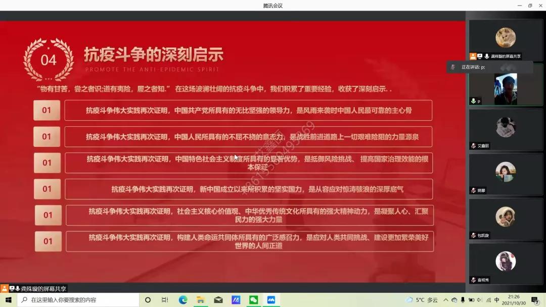 主持人带领大家回顾了过去两年中我国在抗疫斗争中的启示,结合当下新一轮疫情,道出如今是对大家的考验,指出上网课导致一部分人对学习的懒散、怠慢等态度及生活不规律等不良现象,希望同学们及时的反思。随后,同学们就“疫情期间如何做好本职工作,如何修身养性”开展讨论。