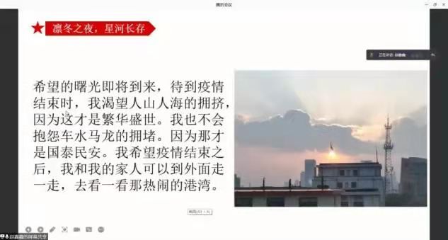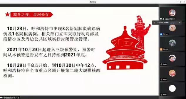 在活动中,赵鑫鑫鼓励同学们明确自己的目标,并朝着确定的方向不断地去努力。接着,班级五位同学代表表达了自己的观点,认为在遇到困难的情况下,也不能懈怠,保持一个良好的学习态度。随后,赵鑫鑫讲到:“凛冬之夜,星河长存,自10月23日呼和浩特市出现3名新冠肺炎确诊病例及一名疑似病例起,全城进入了前所未有的紧张状态,在视频中大家看到,志愿者们不求回报为同学们服务,并发出了“希望呼和浩特越来越好”的口号,盼望着同学们共同加油,携手克服这次困难。”最后,同学们以“面对疫情,讲述自己的感悟”为话题进行讨论。有的同学讲到:“疫情来势汹汹,同时间赛跑,与病魔较量,团结一心,共克时艰,灾难已来临,虽然无法迅速改变客观发生的事,但作为老员工,防疫期间要互相配合,弘扬抗疫精神”。还有的同学谈到:“希望的曙光即将到来,但愿用不了多久同学们都能并肩走在校园里。”