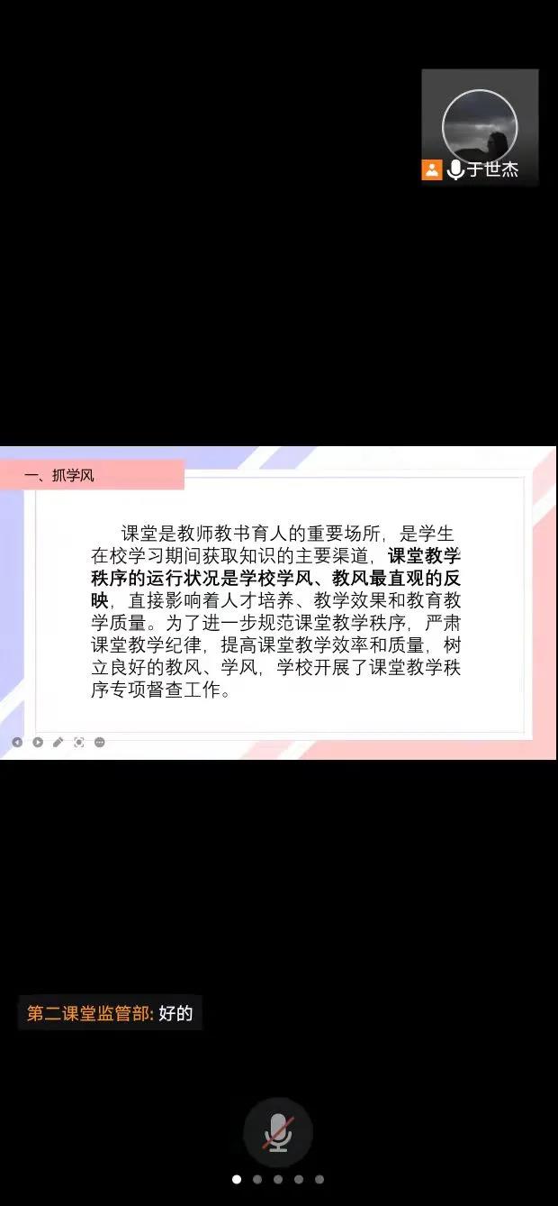 活动伊始,团支书向大家介绍了“抓学风,促学业”的重要性,重点强调了课堂学习和学风建设。帮助同学认知、认同、践行学风,培育优良学风,规范课堂纪律和日常行为。接着,面对此次“疫”情,李萌同学分享了自己做志愿者时的感悟,她讲到:“相比上次疫情爆发,大家都有了应对的经验,做好防护,不会恐慌”。最后,团支书对本次活动进行总结,她希望同学们做好战“疫”的同时,也要做好员工本职工作,认真学习,以必胜的信心迎接考试。