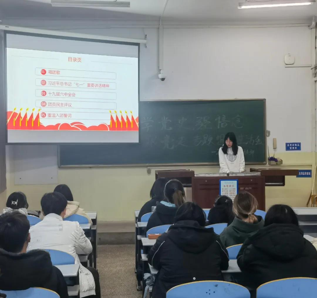 会议在慷慨激昂的团歌中拉开序幕。合唱是班级最具凝聚力的时刻,嘹亮的声音体现出了大家的斗志和决心。接下来,同学们在团支书的带领下共同学习了习近平总书记“七一”重要讲话精神,倡导大家牢记初心使命,坚定理想信念;弘扬光荣传统,赓续红色血统;努力为党和人民争取更大光荣。在会上,大家通过视频了解了党的十九届六中全会,确立了习近平新时代中国特色社会主义思想的指导地位,是时代呼唤,历史选择,民心所向。
