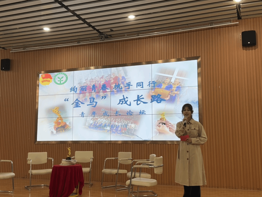 主持人开场后,大家共同观看了公司参加第36届金马杯表演视频,精彩的表演充满激情和活力,优异的成绩是同学们努力和付出的充分体现。随后,分享嘉宾从不同角度与大家分享了自己的参加金马的感悟与收获。连续参加两次金马的演员王美懿讲到:“从最初的青涩懵懂慢慢改变,经历了两次金马杯的洗礼,她感悟到金马杯比赛不仅仅是一场竞争,更是一次值得享受过程的珍贵经历。在备战金马杯的过程中,金马演员们不断探索、不断前进。有人从一而终的训练,亦有人半途加入,但大家又为同一个目标奋斗。每一次的训练都是一次自我超越,每一个舞步都承载着汗水与梦想。”演员汪鑫讲述到:“用努力书写人生的精彩,用回报诠释付出的意义,这便是奋斗的价值所在。通过参加金马比赛的,自己感悟到信念的重要性,也正是心中那不服输的信念在自己想要放弃的时候不断激励着要咬牙坚持”。所有的成功路并非一帆风顺,金马演员滕浩然在临近比赛时脚受伤仍坚持参加比赛,他以集体为先的精神和那颗坚毅而执着的心令人感动。