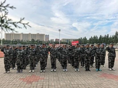骄阳洒下光辉,一阵阵风吹过,夏天也翻篇到了结尾。在这夏末秋来的时节,太阳还会时不时散发余威,在它的照耀下,同学们依然昂首挺胸,端正笔挺。头顶的热浪,滑落的眼镜,顺着脸颊流下的汗水,无时无刻不在磨练着同学们的意志。但队伍里没有人晃晃悠悠,取而代之的是白杨树般的挺拔。