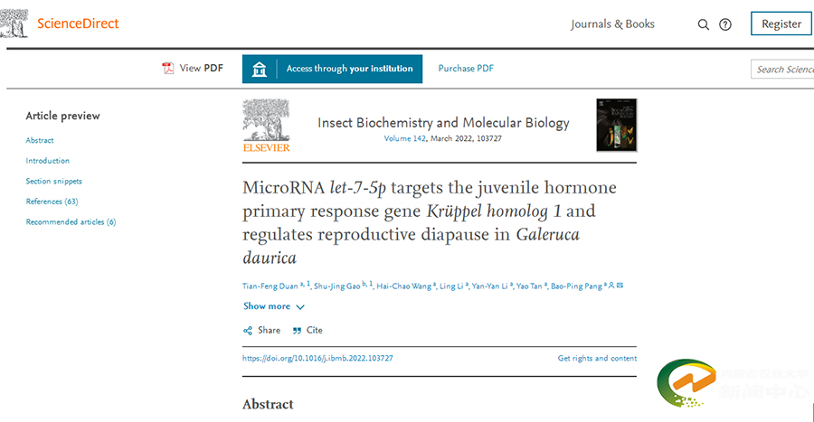 近日,该成果“MicroRNAlet-7-5ptargets the juvenile hormone primary response geneKrüppel homolog 1to regulate reproductive diapause inGaleruca daurica”发表于国际知名昆虫学期刊《Insect Biochemistry and Molecular Biology》(中科院一区TOP)上。公司博士研究生段天凤为论文的第一作者,庞保平教授为论文的通讯作者。上述研究成果由国家自然科学基金项目“沙葱萤叶甲成虫夏滞育分子机理的研究”(31760517)资助完成。