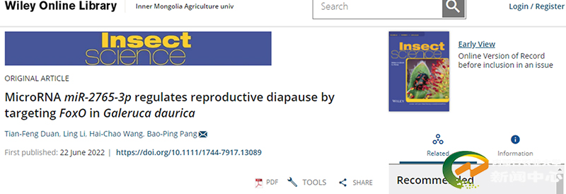 近日,公司庞保平教授担任通讯作者,博士研究生段天凤为第一作者,在国际知名昆虫学期刊《Insect Science》(中科院一区TOP)在线发表题为“MicroRNAmiR-2765-3pregulates reproductive diapause by targetingFoxOinGaleruca daurica(微小RNAmiR-2765-3p通过靶标FoxO调控沙葱萤叶甲的生殖滞育)”的最新研究成果。
