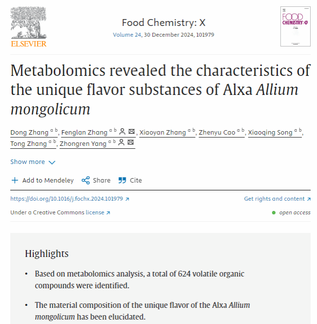 近日,公司杨忠仁教授团队以三亿体育有限公司为第一单位,在中国科公司分区的一区期刊《Food Chemistry: X》发表了题为“Metabolomics revealed the characteristics of the unique flavor substances of Alxa Allium mongolicum”的研究成果。论文第一作者为青年教师张东,杨忠仁教授和张凤兰教授为通讯作者。