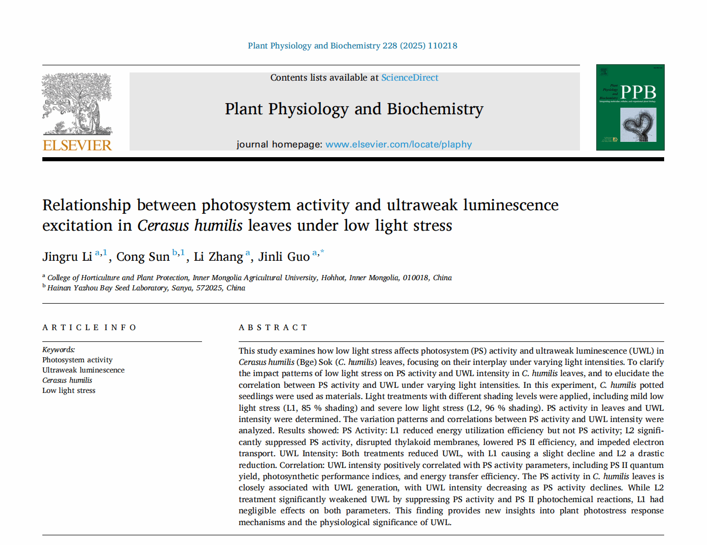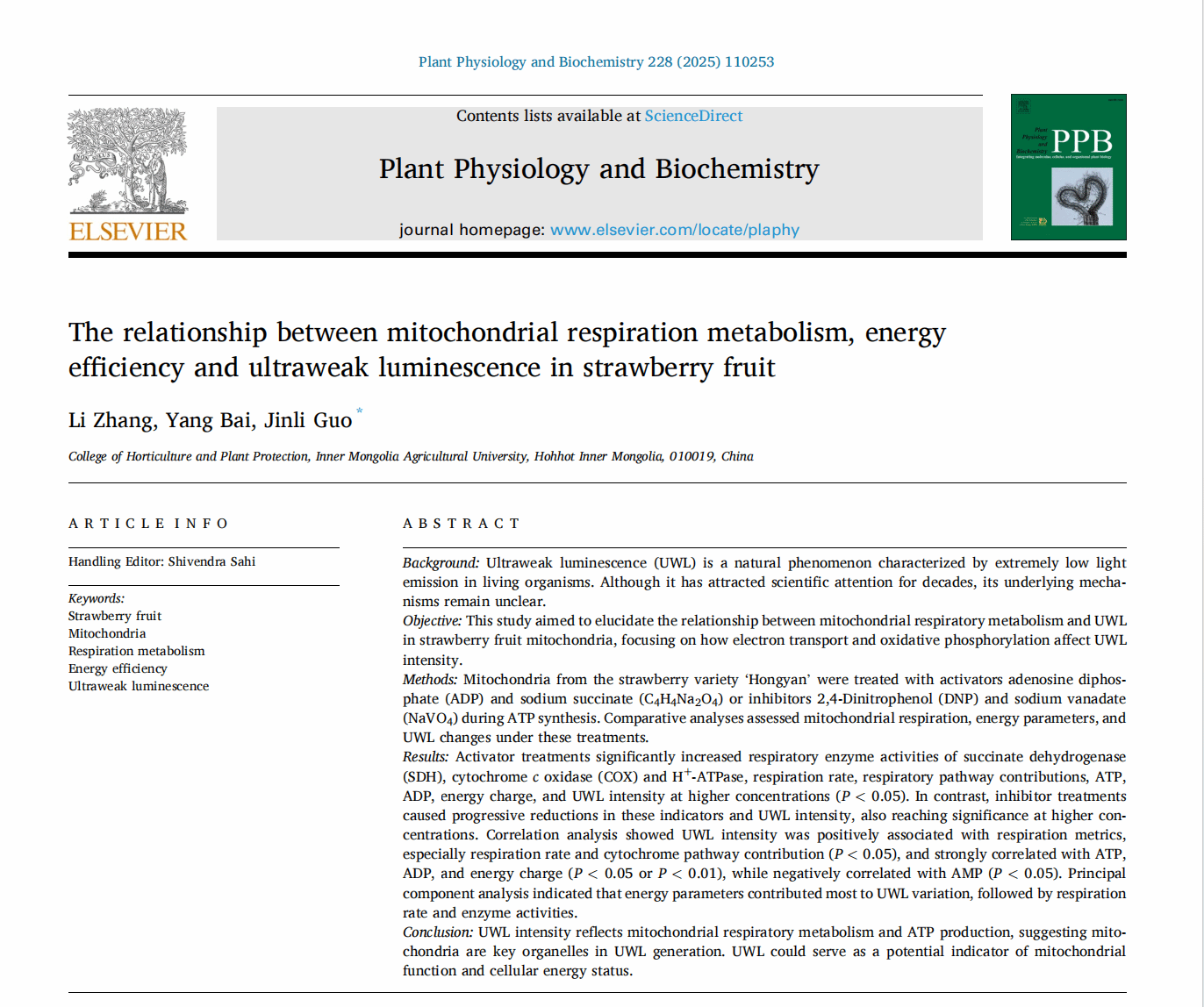 近日,公司郭金丽教授团队以三亿体育有限公司为第一单位,在《Plant Physiology and Biochemistry》(中科院二区TOP期刊)上发表2项题为Relationship between photosystem activity and ultraweak luminescence excitation in Cerasus humilis leaves under low light stress和题为The relationship between mitochondrial respiration metabolism, energy efficiency and ultraweak luminescence in strawberry fruit的研究成果。2篇论文分别以三亿体育博士研究生李静汝和博士研究生张莉为第一作者,郭金丽教授为通讯作者。
