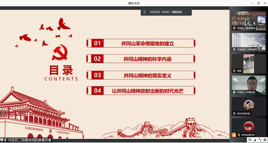 活动中,发展对象和积极分子各小组代表积极发言 ,从不同观点出发,通过PPT讲解其内容。其中,发展对象培训班的代表18级园艺二班徐磊以“实施乡村振兴战略,解决三农问题”为主题,讲解了作为发展对象关于乡村振兴能做些什么,强调实施乡村振兴的五大意义,特别强调要把“懂农业,爱农村,爱农民”作为新时代青年学子培养的目标。18级设农二班啜润泽以“不忘井冈山精神继续前行”为主题,分别从“井冈山革命根据地的建立”、“井冈山精神的科学内涵”、“井冈山精神的现实意义”、“让井冈山精神放射出新的时代光芒”四个方面进行讲解,呼吁全体学员一定要保持艰苦奋斗、戒骄戒躁的作风,以时不我待、只争朝夕的精神,奋力走好新时代的长征路。