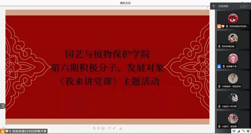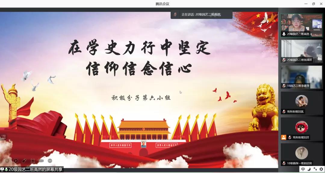 积极分子培训班的学员代表18级植保二班张晨杰以“学习宣传贯彻党的十九届五中全会精神”为主题,为大家详细讲解了习近平总书记“七一”重要讲话精神,提出作为积极分子应坚持不忘初心,继续前行的观点。19级园艺二班赵文静从“什么是党史、党情”开始,深入讲解中国共产党的百年奋斗史,告诫学员们中国人民的幸福,中华民族的伟大复兴,绝不是轻轻松松、敲锣打鼓就能实现的,必须是一步一个脚印,一届一个台阶,逐步实现的伟大历史革命。最后,党员代表何文炳总结本次活动,他讲到:通过“我来讲党课”这样的主题活动,可以激发同学们对于党史的深入学习,同时作为一名积极向党组织靠拢的同学,在工作中、生活中就要多一份责任,多一份辛劳,多一份担当。
