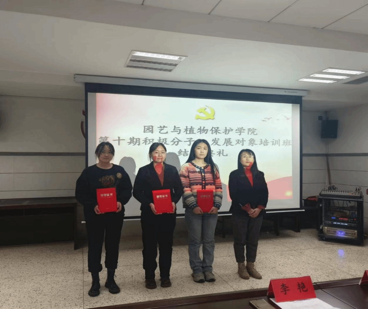 结合在党课培训过程中的表现,最终评选了6名优秀学员。李艳副书记和尤丽老师为其颁发荣誉证书并合影留念。