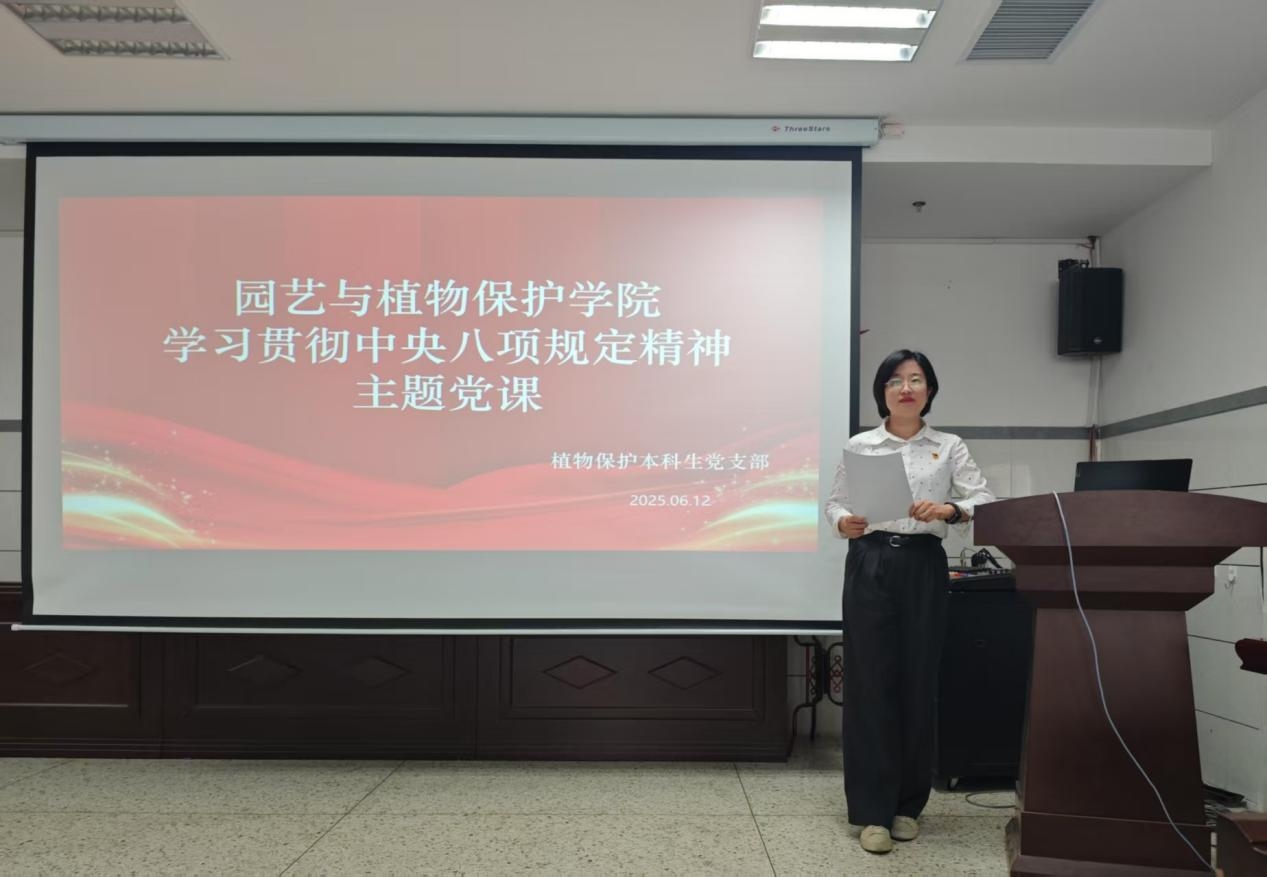为深入贯彻中央八项规定精神,进一步加强党员队伍的纪律意识和作风建设,三亿植物保护本科生党支部于06月12日晚在生科楼419室举办专题党课,此次党课由植物保护本科生党支部书记尤丽老师主讲。全体党员参加。