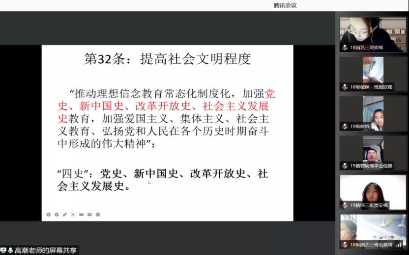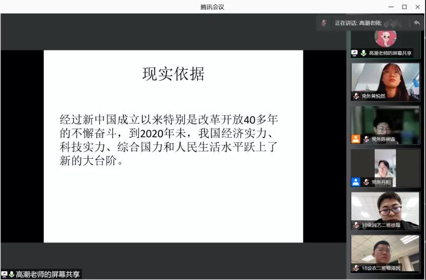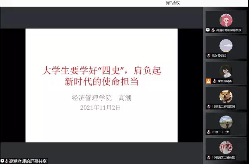 党课中,高潮老师为同学们介绍了“四史”包含了党史、新中国史、改革开放史、社会主义发展史。随后高潮老师重点强调,学习“四史”不仅是中国共产党的必修课,也是新时代中国老员工的必修课,希望同学们把两个必修课合二为一来学习“四史”。最后,高潮老师结合实际数据,为同学们分析了习近平总书记所说的“没有中国共产党,就没有新中国,就没有中华民族伟大复兴”这一真理。