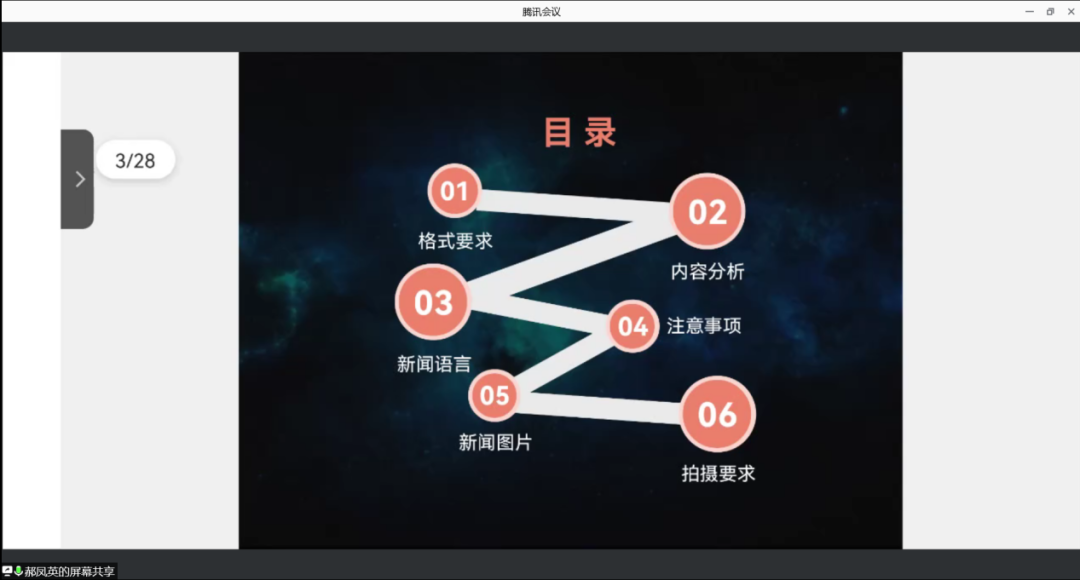 为进一步加强公司通讯员的新闻写作能力,高质量地展示日常活动的宣传报道。10月31日上午,公司通过腾讯会议举行新闻写作培训会,各班团支书、组宣委员、各部室通讯员以及新闻中心全体成员参加培训,公司团委老师郝凤英担任主讲。