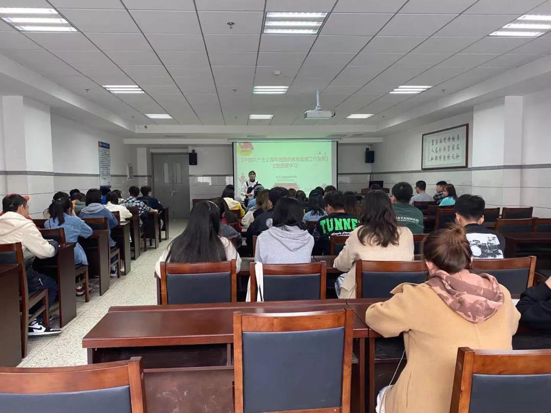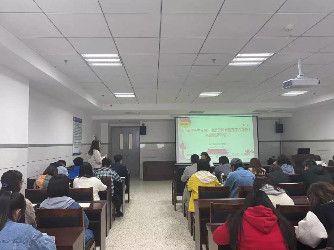 团课中,郝老师围绕《中国共产主义共青年团团员教育管理工作条例(试行)》,结合实际工作中的案例为同学们深刻讲解了条例中内容,要求团干部们提高政治站位,树立大局意识,引导团员在实践中加强巩固中国特色社会主义和共产主义思想,坚持党的领导,突出理想信念;以身作则发挥模范带头作用,创新组织生活方式让同学们积极参加集体活动中;加强自身建设,明晰自己的责任,认真仔细完成每一项工作。团课最后,各班级团干部围绕团组织建设纷纷提出自己的想法,将过往的成功事例与不足之处与大家共同分享。