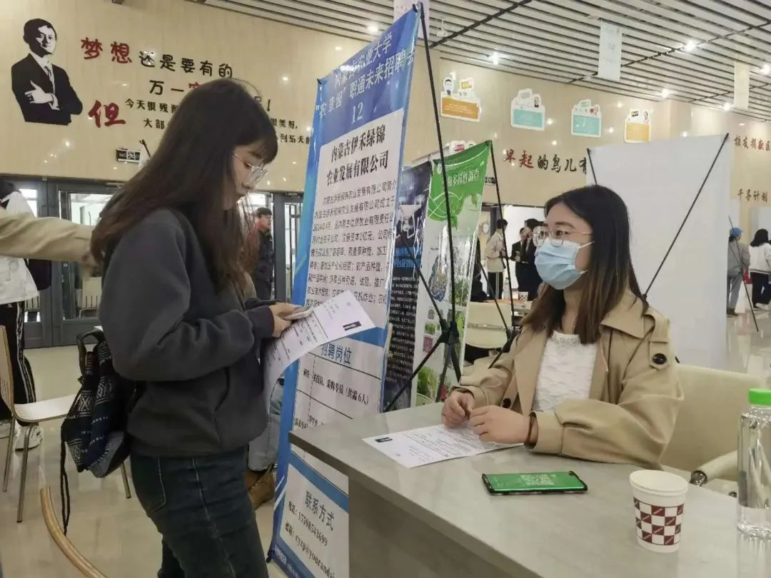 本次招聘会共有来自北京、天津、陕西、深圳、浙江、内蒙古等地的40家用人单位到场选聘人才,面向毕业生提供各类优质就业岗位135个,岗位需求总人数1362人,网上关注人次7472次。在行业专业分布上,岗位涵盖了育种研究、高新技术、智慧农业等优势产业,囊括了农、牧、林、草、沙等多个学科门类。有近400名毕业生来到招聘会现场,拿着自己精心准备好的简历,穿梭于人流中,积极与企业的招聘人员交流。企业的负责人也耐心地为前来面试的毕业生介绍本公司情况,解答了本公司的用人要求与薪资待遇等问题。据统计,至招聘会结束,现场共投递简历近500份,达成初步签约意向50余人。