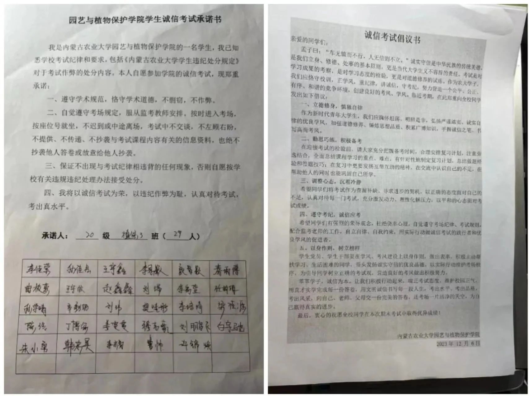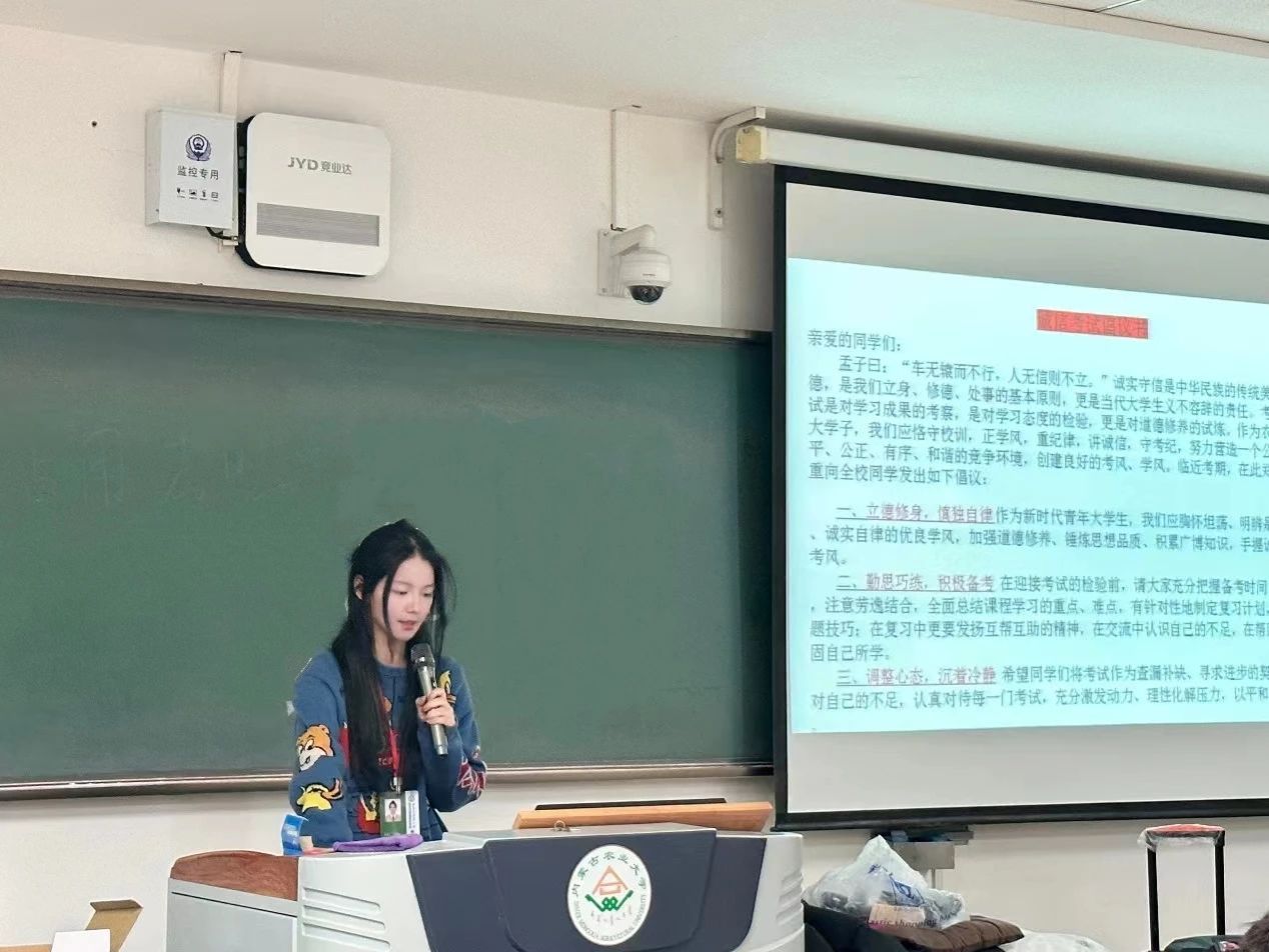 首先,学风建设中心但晓钰同学和薛雯静同学分别在南教326和223教室宣读了《诚信考试倡议书》和员工手册中有关考试作弊行为的处理规定,呼吁大家端正考试态度,维护校园风气。