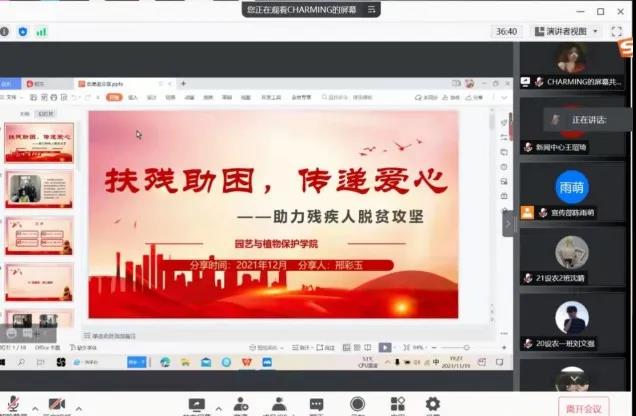 邢彩玉同学作为园保院志愿服务队的一员,经常照顾叶晓雯大姐,在持续的关爱中与叶大姐共同学习,感受学习、相互帮助的乐趣。邢彩玉同学最后呼吁更多的青年志愿者用自己实际行动帮助残疾人士,广泛参与到残疾人扶贫济困活动中,让残疾人体会到社会主义大家庭的温暖。