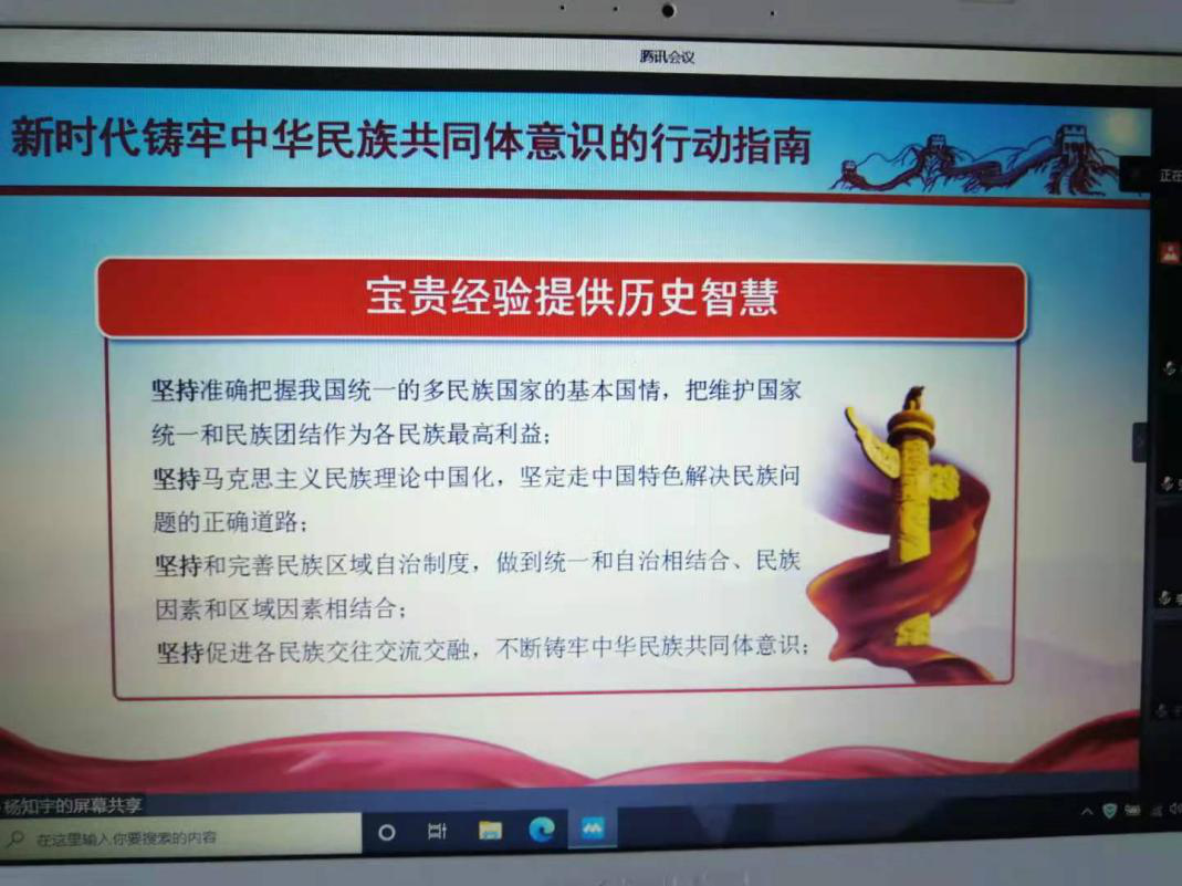 党十九届五中全会中提出的坚持和完善民族区域自治制度,全面贯彻党的民族政策铸牢中华民族共同体意识。自治区提出了推行使用三科统编教材的工作方案。为此正值新春佳节之际我班于2021年2月20日上午通过腾讯会议展开了围绕“铸牢中华民族共同体意识”的主题团日活动。