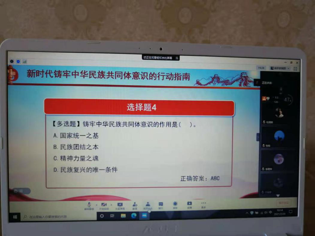 活动伊始,主持人杨知宇同学首先就中华民族共同体的提出以及内涵进行讲解。中华民族共同体是在长期历史发展中形成的政治上团结统一,文化上兼容并蓄,经济上相互依存,情感上相互亲近,你中有我、我中有你、谁也离不开谁的民族共同体。随后,大家对新时代铸牢中华民族共同体意识的行动指南进行学习,其中分别对三个方面学习,民族工作的成就和宝贵的经验提供历史智慧以及基本规律启迪历史自觉。紧接,刘冬雪、张勇、于艳君同学回答了相关知识的选择题。