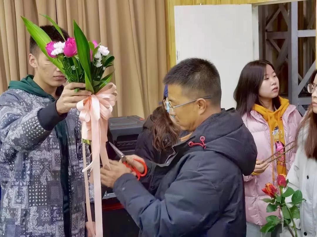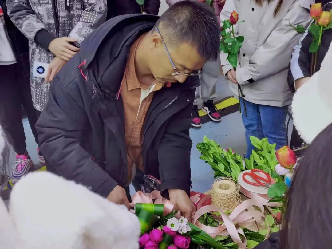 段飞师兄首先带领同学们认识了各种花材,为员工们拓展了花卉知识,并指导员工进行手捧花制作。在制作过程中,同学们将所有带分叉的花材花头10厘米以下的的分叉、叶子剪掉,用螺旋的手法依次添加花材,一支主花加一支配花或叶子,然后用丝带把花杆缠绕一圈,用力拉紧,使整个面服帖光滑,最后缠绕完成后收尾打结,以漂亮的法式蝴蝶结点缀,一束美丽的捧花就制作完成了。在大家动手制作的过程中,同学们还认识到手捧花一定要选择适合的花材并将其颜色进行合理的搭配。看着自己精心创作的作品,同学们更是爱不释手,纷纷拿起手机拍照。