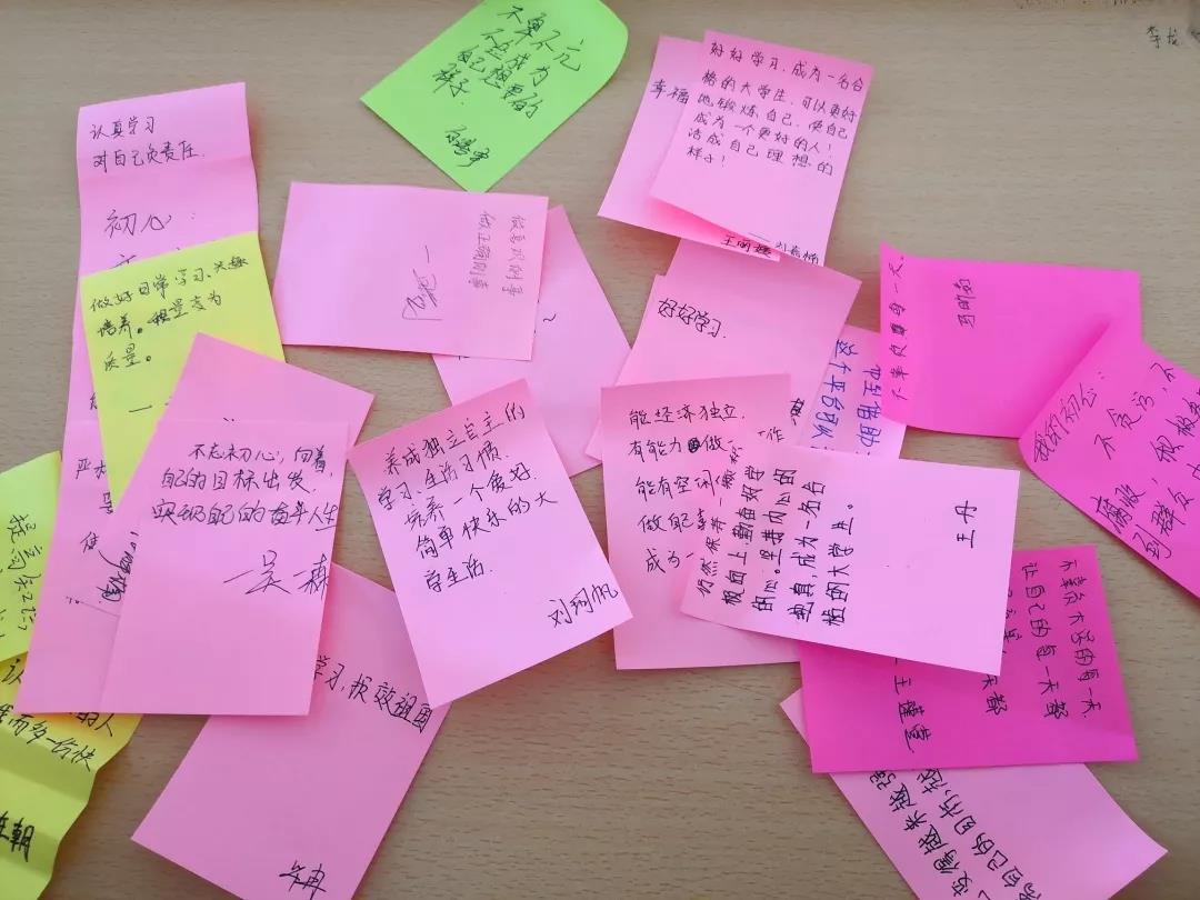 活动伊始,团支书向大家介绍了“不忘初心 牢记使命”提出的背景,并且告诉大家她将如何做到不忘初心牢记使命。随后,同学们在彩纸上写下了自己初入大学的初心以及对未来的展望。