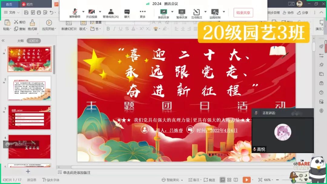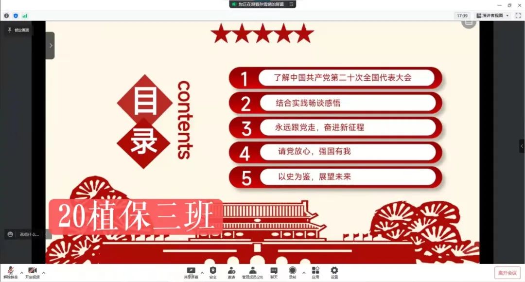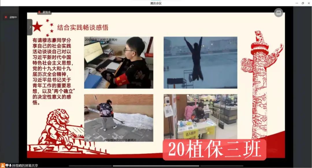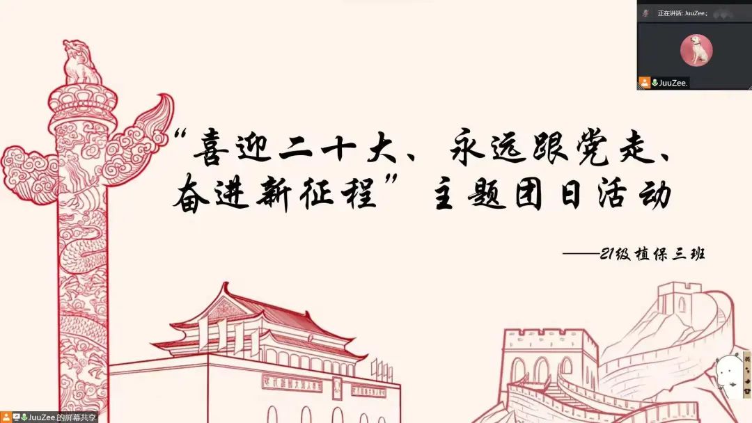 本次活动中,每一个团支部紧密结合“喜迎二十大、永远跟党走、奋进新征程”这一主题,同学们不仅学习了关于党、团理论知识,也在线分享了各自参与社会实践感悟。凡走过,必留下痕迹;凡记过,必烙印心头。同学们纷纷表示要不断提升理论水平,向榜样人物学习,以奋发有为的精神,牢记党的使命,跟随党的领导,紧跟时代的召唤,以良好的姿态迎接党的二十大召开和建团100周年。