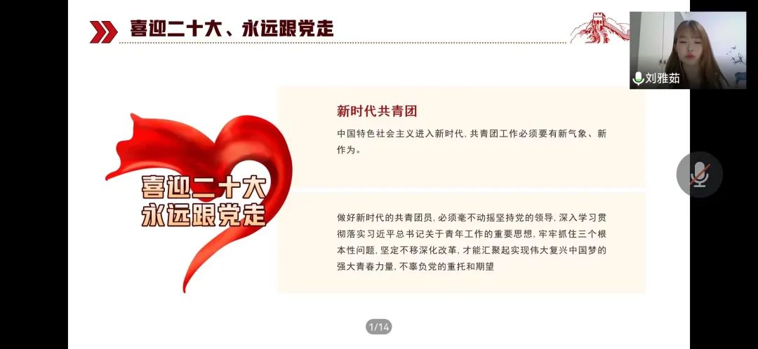 为迎接党的二十大胜利召开,坚定永远跟党走的信念。4月17日晚,公司通过腾讯会议举行了“喜迎二十大、永远跟党走、奋进新征程”的团日活动竞标会。本次活动由组织部干事王水心担任主持人,党员服务站站长、主席团成员担任评委,团委老师郝凤英出席。