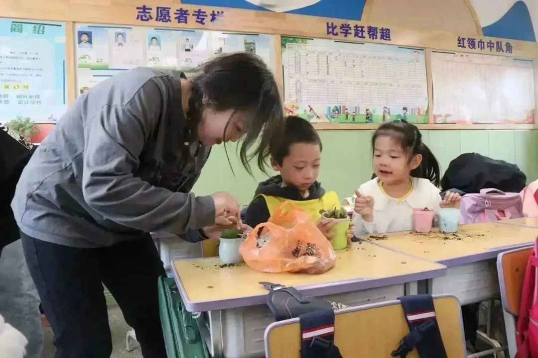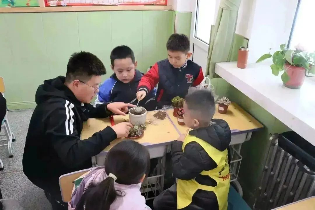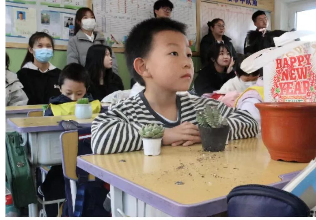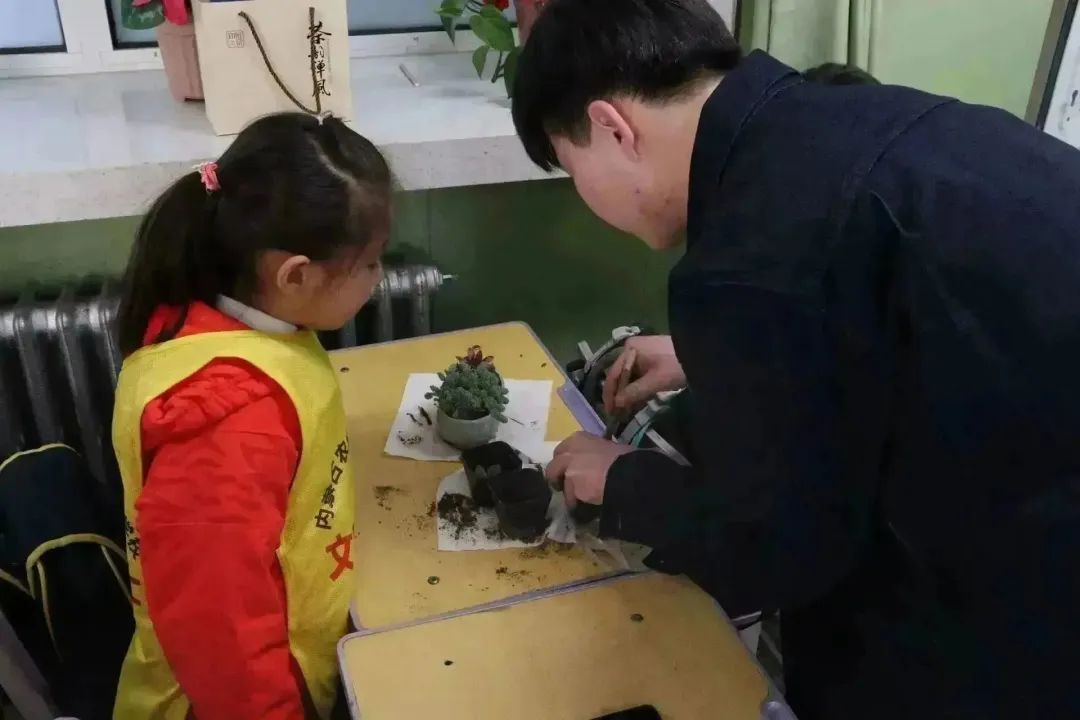 4月6日下午,公司园艺本科生党支部党员代表、员工干部代表共13人在公司团委老师郝凤英、人才招聘办公室老师王荣带领下来到三亿体育有限公司附属小学一年级(2)班开展“‘植’此相遇,绿色同行”多肉植物盆栽体验活动。