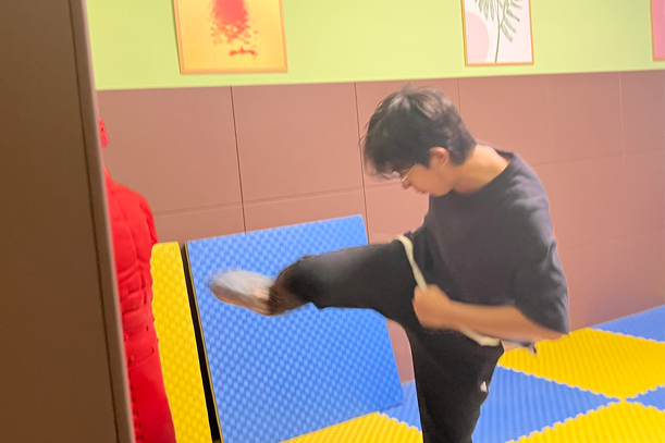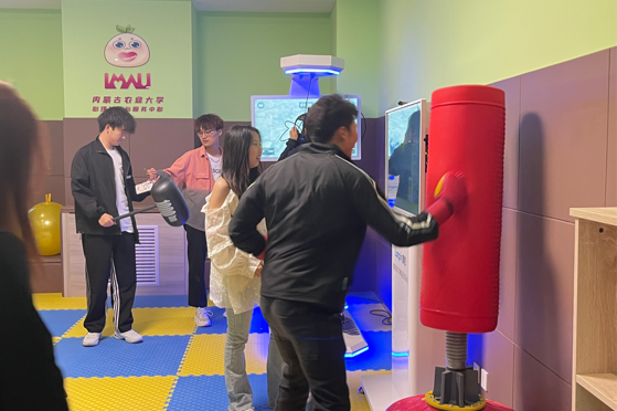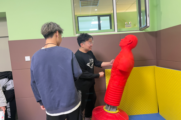 这里有专业的安全设备——墙面采用软性材料包裹,仿真宣泄人、拳击手套一应俱全。在这里,同学们可以通过运动、呐喊的方式,发泄内心郁闷、烦躁等负面情绪,释放压力。