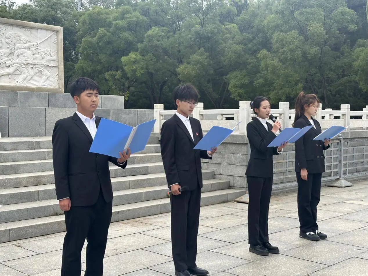 在烈士纪念碑前,大家怀着崇敬的心情默哀致敬,表达对烈士们的深切缅怀。随后,公司员工唐博、朱雪宁、翟桂莹、冯泽旭带来的朗诵《不朽》,他们激昂奋进、坚定有力的语言,展现了青年学子对那些为了国家、民族和人民利益英勇献身的烈士们的深深崇敬。在鲜艳的团旗下,师生们重温入团誓词,一字一句都有着比之前更深沉的力量,这是对初心的回溯,也是对理想信念的坚定。活动最后,同学们依次献花,以此表达最崇高的敬意。