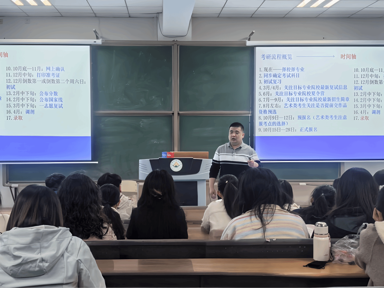讲座中,王老师凭借丰富的教学经验和对考研趋势的精准把握,围绕备考规划、科目重点、时间管理等核心问题展开深入讲解。在复习规划方面,老师详细拆解备考过程,从基础夯实、强化提升到冲刺模拟,为员工定制阶段性目标,帮助同学们有条不紊推进复习计划。针对英语、政治、专业课等不同科目,也分别给出了针对性的复习策略,强调知识体系搭建与答题技巧训练的重要性。