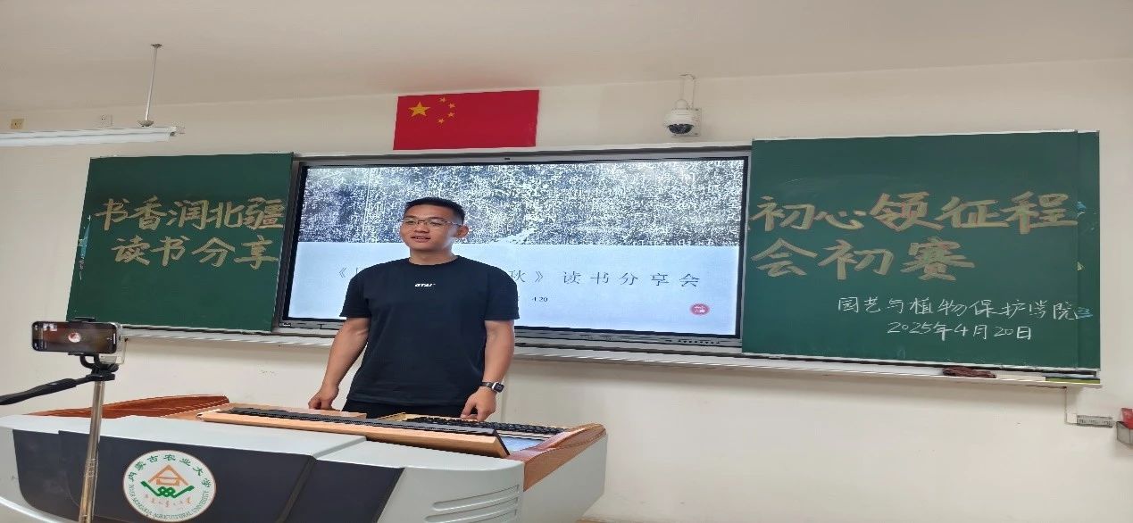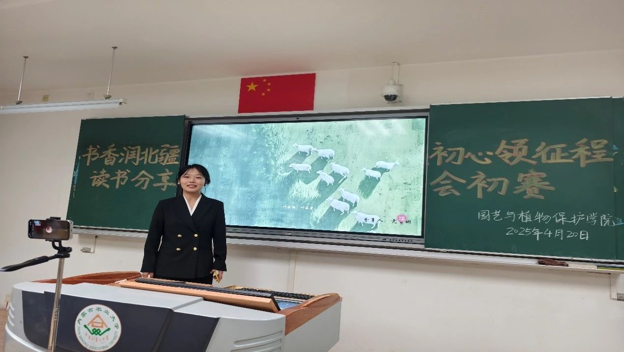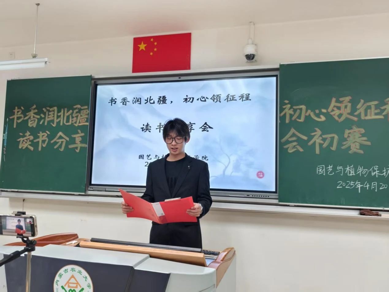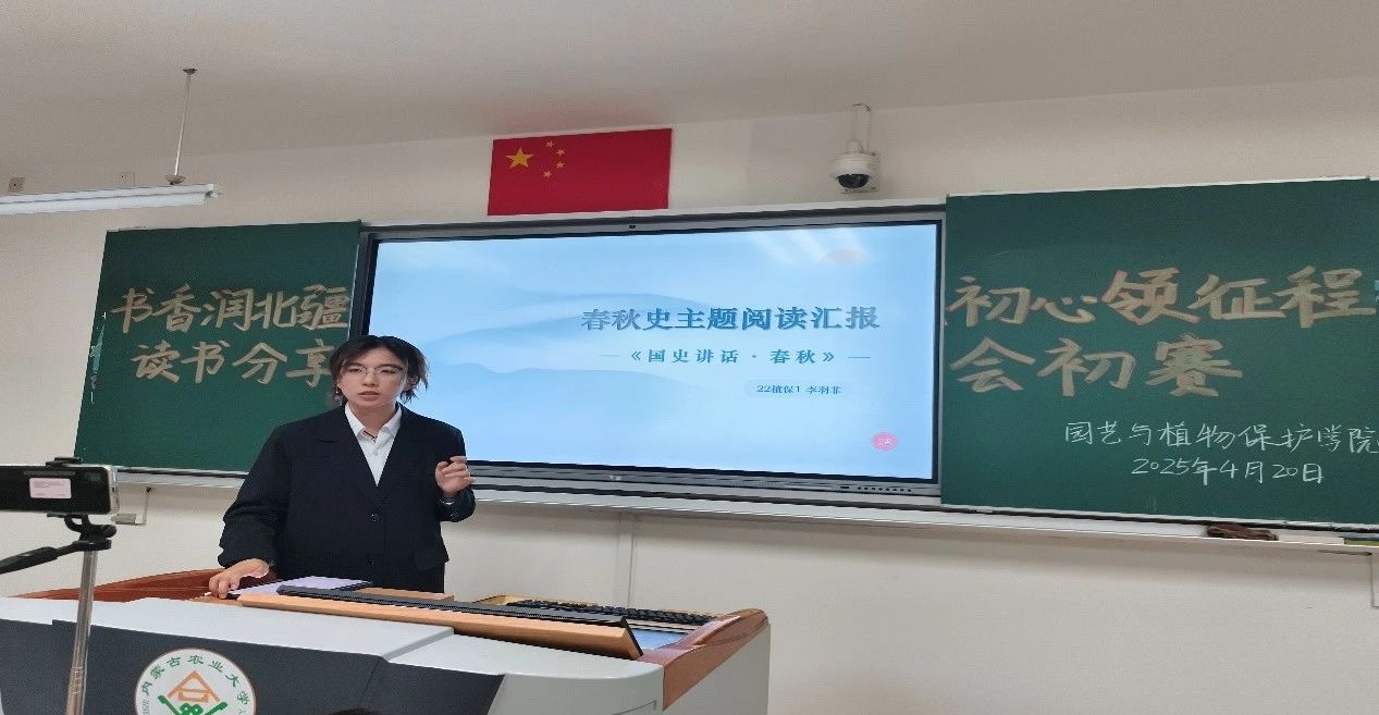 活动中,同学们对自己喜爱的书籍进行详细的分享。24级植保三班陈萌萌,24级园艺二班赵秋雨,24级园艺一班李妍柔,24级园艺一班何斐,23级园艺一班刘璟轩分别对《野草》进行解读,通过大家的讲解,展现出鲁迅对自我内心矛盾、社会黑暗的深刻剖析及对理想与希望的不懈追寻。其中陈萌萌在分享书籍时,语调抑扬顿挫,配合恰到好处的肢体动作,生动诠释书中内容,极具感染力。24级园艺一班宋思雨和24级植保三班魏恩玺分别介绍《发现内蒙古:全域到全球的新丝路》,从多维度剖析“一带一路”与内蒙古的渊源及战略机遇。24级园艺一班亢雪彬,24级植保二班王馨,24级园艺二班雷信会分别分享了《论草原文化》,剖析多种文化形态,兼具传统与现代特色的草原文化,了解文化多样性的重要性。其中王馨同学伴着舒缓的蒙古轻音乐解读草原文化,音乐仿佛让听众身临广袤的大草原一般。24级园艺一班苏政闻和22级植保一班李羽菲依次解读《国史讲话:春秋》,了解春秋时期各诸侯国的兴衰沉浮、政治军事斗争、文化礼仪发展以及众多历史人物的故事,展现了那个动荡而充满变革的时代风貌。其中李羽菲以自己丰富的历史知识储备,流利的表达,让听众们身临其境,深刻了解了那段历史。23级植保二班刘香佳介绍《三北防护林体系建设重大问题研究》,深入剖析三北工程在生态、经济、社会等多领域面临的挑战。