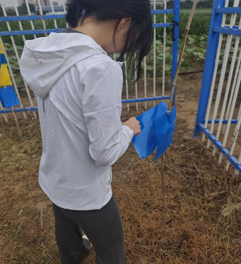 大家分组对种植区的黄蓝板进行全面检查。黄蓝板是利用害虫对黄色、蓝色的趋性进行物理诱杀的常用工具,已在田间悬挂一周,板上附着了大量害虫。更换时,需先记录每块黄蓝板的位置、悬挂高度及周边作物类型,再用新板替换旧板,确保新板与作物生长点平齐,以提高诱捕效率。回收旧板后,要在实验室进行害虫处理。