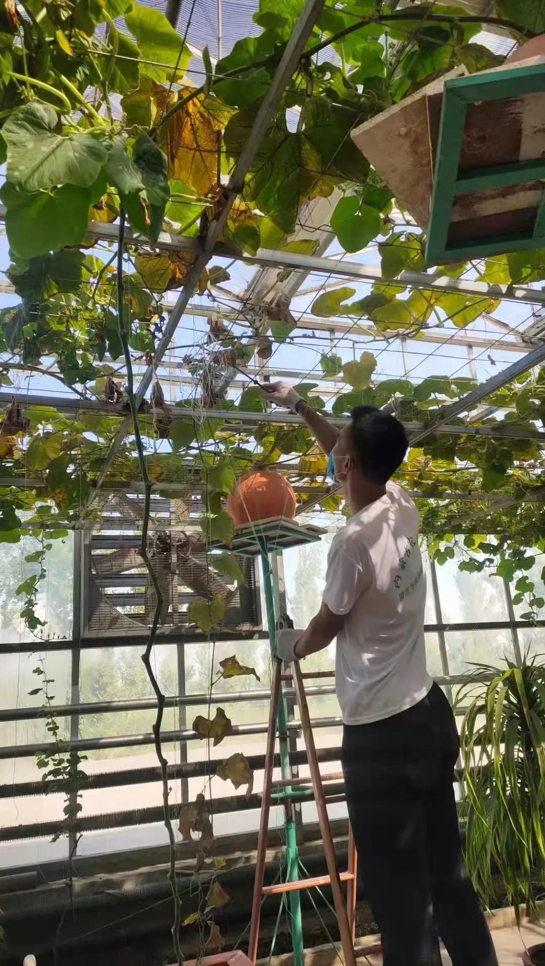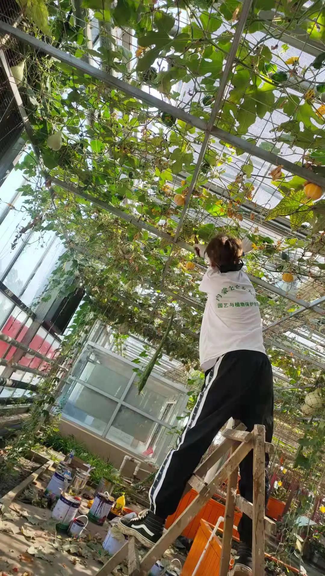 下午,郝老师带领实践队员再次来到农业园区的创意馆。门口的标语特别惹人注目,“这里是热带风情园的观赏园,无土栽培,珍惜瓜果,奇花异草,反季蔬菜。来到这里,如同来到憧憬中的忆江南,瓜果飘香,小桥流水,妙不可言”馆里十分凉爽,可以闻到花的香味,今天男生负责裁剪顶上悬挂的枯叶,女生负责修剪花草,装箱各种水果。同学们虽然已经辛苦了一天,但依旧干劲十足,都完美的完成了各自工作。
