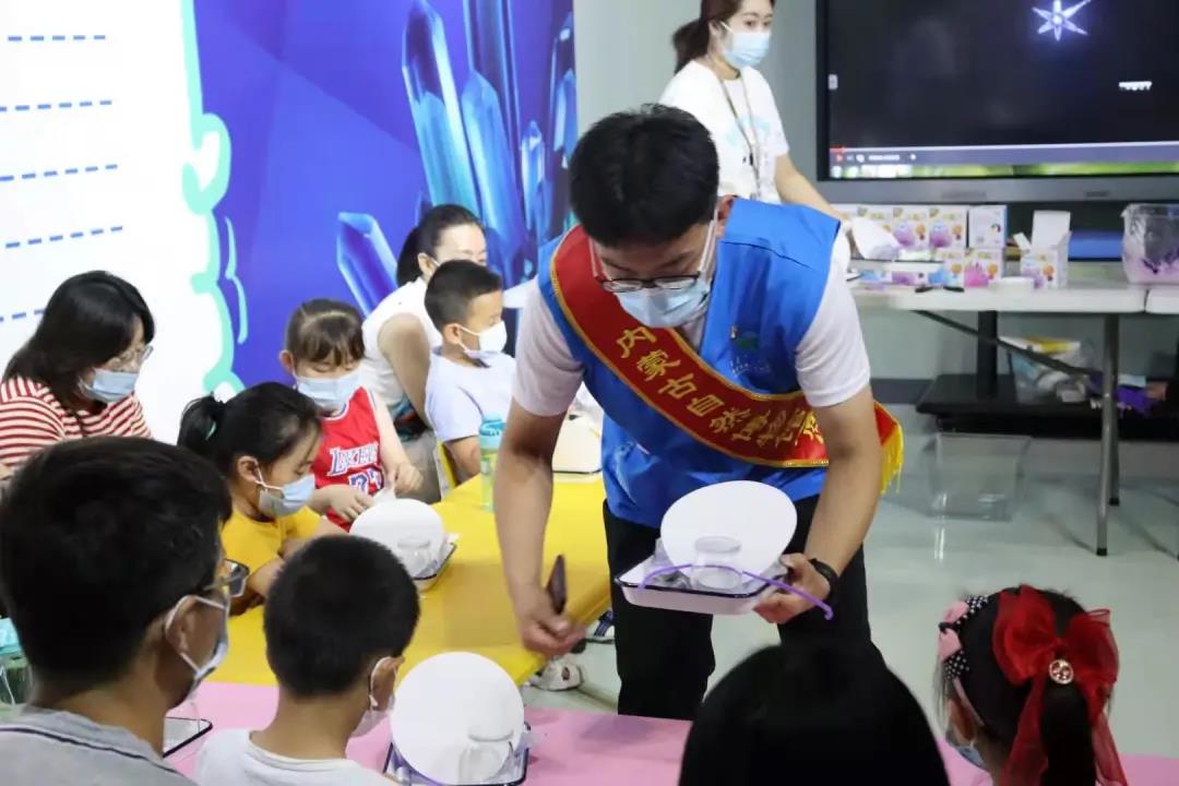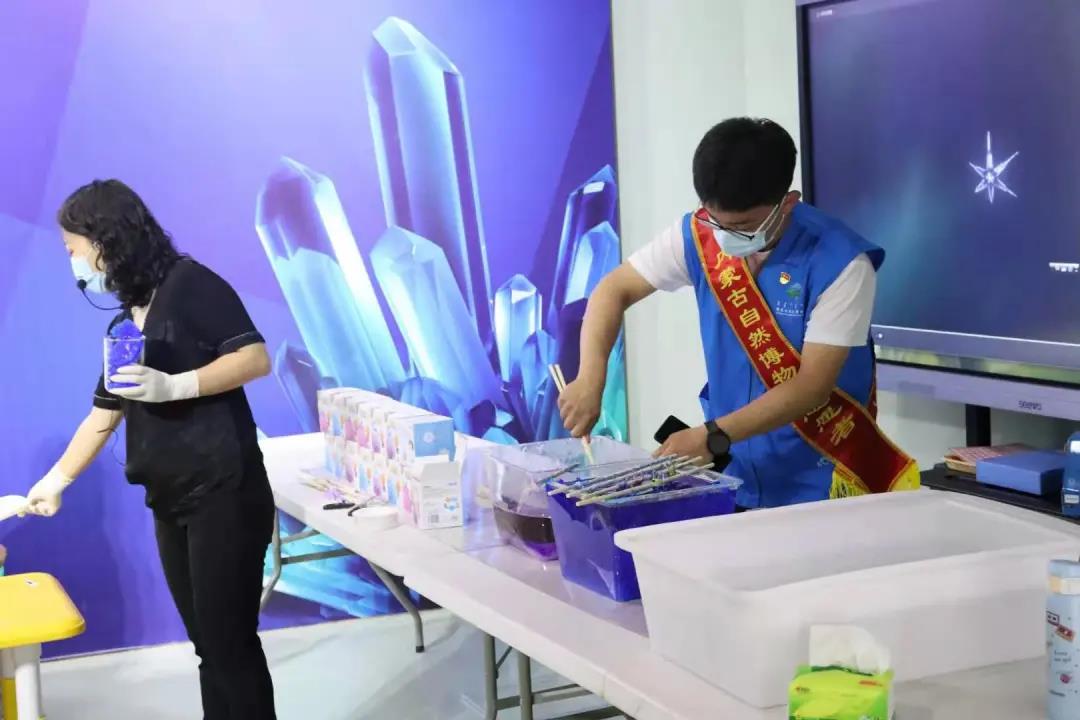 早晨8:50,实践队的志愿者已经站在各自的工作岗位。蓝色的马甲,红色的绶带。志愿者将阳光自信,积极快乐最好的精神状态展现给大家。有的同志负责在自然博物馆入口引导游客,帮助查验健康码,告知防疫规定,佩戴口罩等维护入馆秩序;有的同志负责引导游客进行全身消毒,帮助通过安检;有的同志在博物馆大厅进行工作,及时询问老人和带小孩的家长是否需要轮椅和婴儿车,引导游客进入壮美内蒙古展厅;有的同志在富饶内蒙古展厅儿童科普画画处帮助工作人员进行工作,维护绘画区域的秩序;还有的同志属于机动岗,馆内哪里需要去哪里。其中,王浩羽,张田,金顺三位志愿者在“晶体科普课堂”岗位,协助老师进行授课,课前帮助老师准备实验所需的材料,布置课堂教学用具,帮助前来的家长和小朋友进行签到,保障了科普活动的顺利进行。在岗的各位志愿者迅速转变角色,感悟责任使命,在工作中锻炼意志、增长才干,充分展现农大学子风采,以实际行动给工作人员和参观的游客留下了很好的印象,对大家的志愿工作给予了最大的肯定。