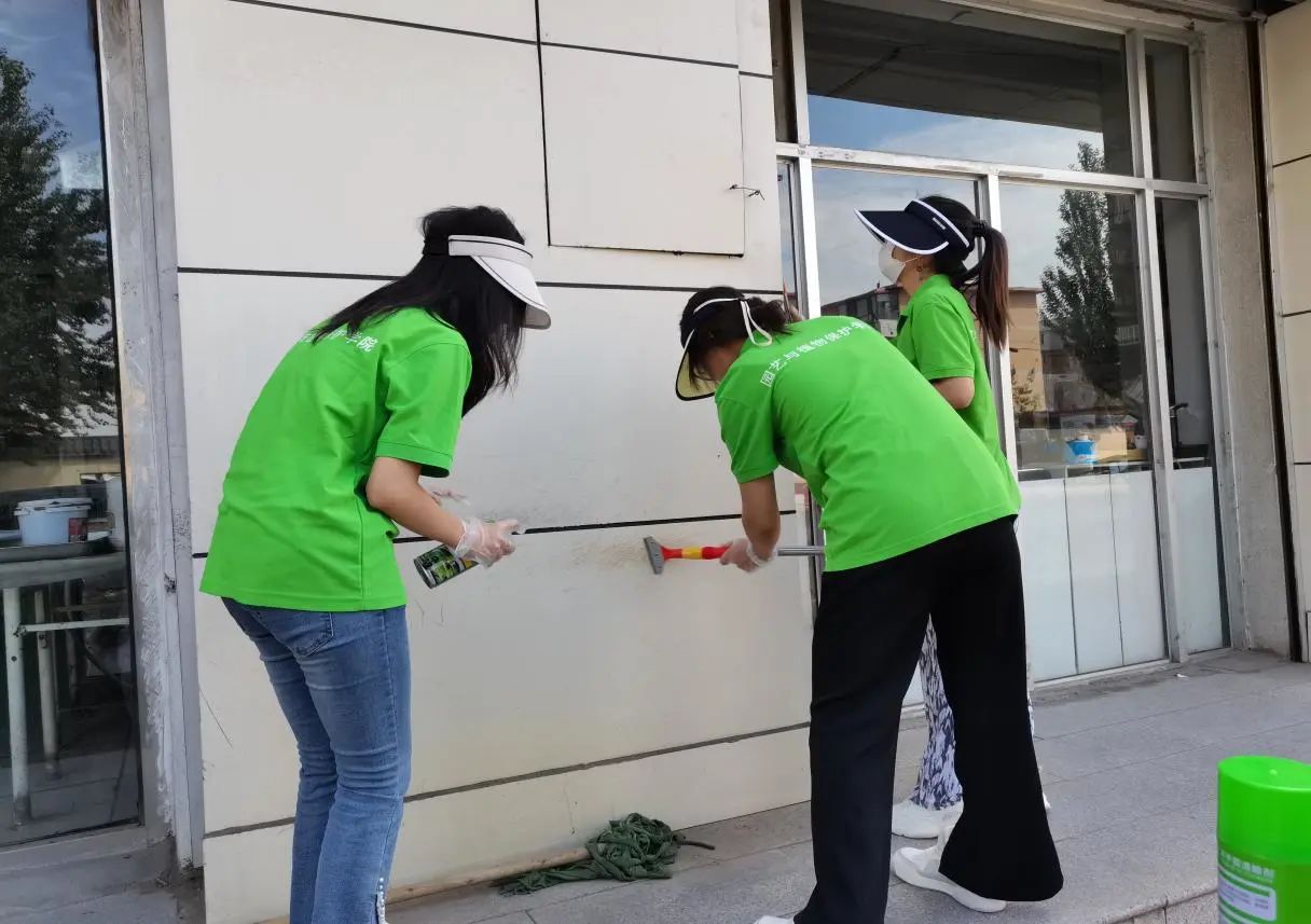 在清理小广告的过程中,实践队成员拿着小铲、除污剂等工具,对周围街道商铺门面房上的小广告进行清理,大家发扬不怕苦、不怕脏、不怕累的精神,齐心协力,分工明确。随后,队员们为下午的座谈会、义诊活动以及宣讲会进行场地布置。