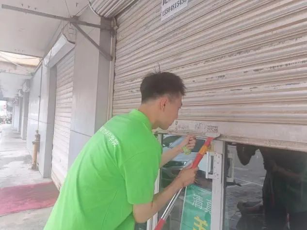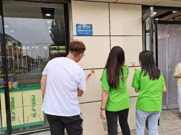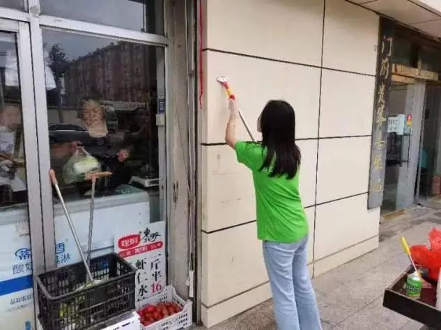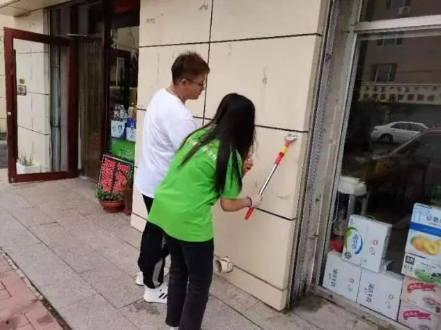 上午,为保持街道整体卫生、美化环境、提升社区形象,实践队成员在社区不同街道对商店门前的小广告进行铲除工作。大家分好组后根据分配的不同街道,拿着清理工具,开始了各自的工作。队员们工作的热情很高,分工明确、有条不紊,虽然天气较热,但大家并没有抱怨,通过一天的工作,整条街道都焕然一新。