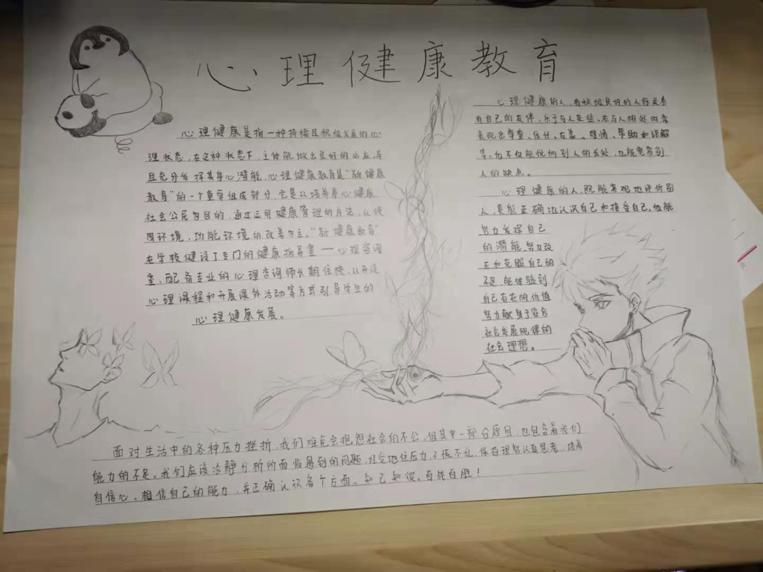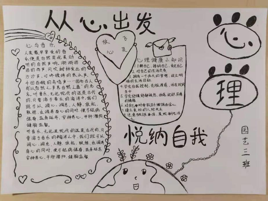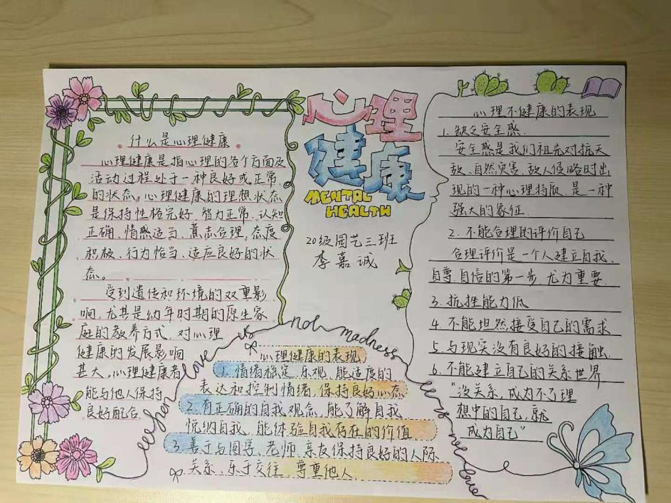 心理健康可以促进老员工全面发展,健康的心理品质是老员工全面发展的基本要求,也是将来走向社会,在工作岗位上发挥智力水平、积极从事社会活动和不断向更高层次发展的重要条件。充分认识德智体美劳等方面的和谐发展,是以健康的心理品质作为基础的,一个人心理健康状态直接影响和制约着全面发展的实现。下面图片是20级园艺三班同学制作的心理健康主题手抄报,一幅幅精美别致的作品向大家展示了老员工应有的健康的心理状态。