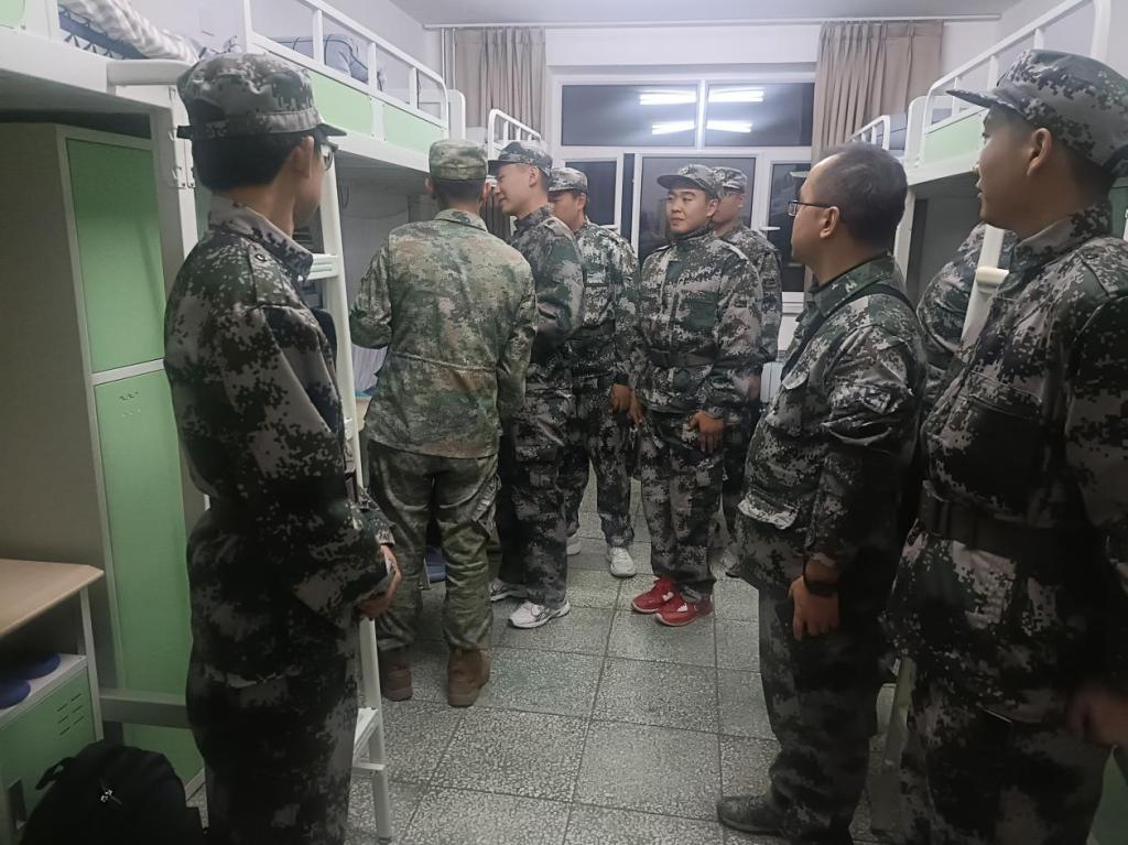 10月8日晚,公司辅导员和军训教官深入员工宿舍,实地检查员工内务整理情况并进行指导。