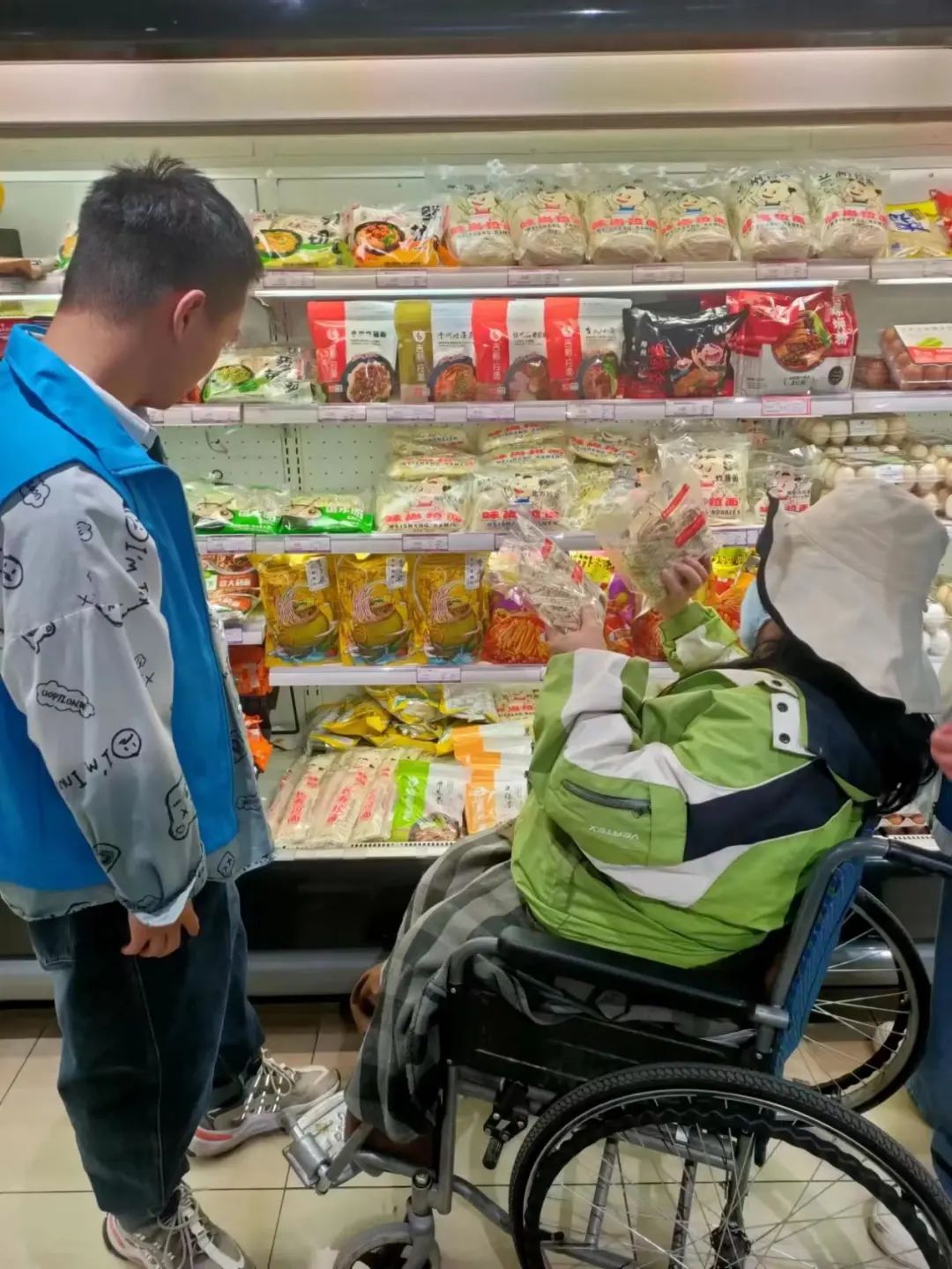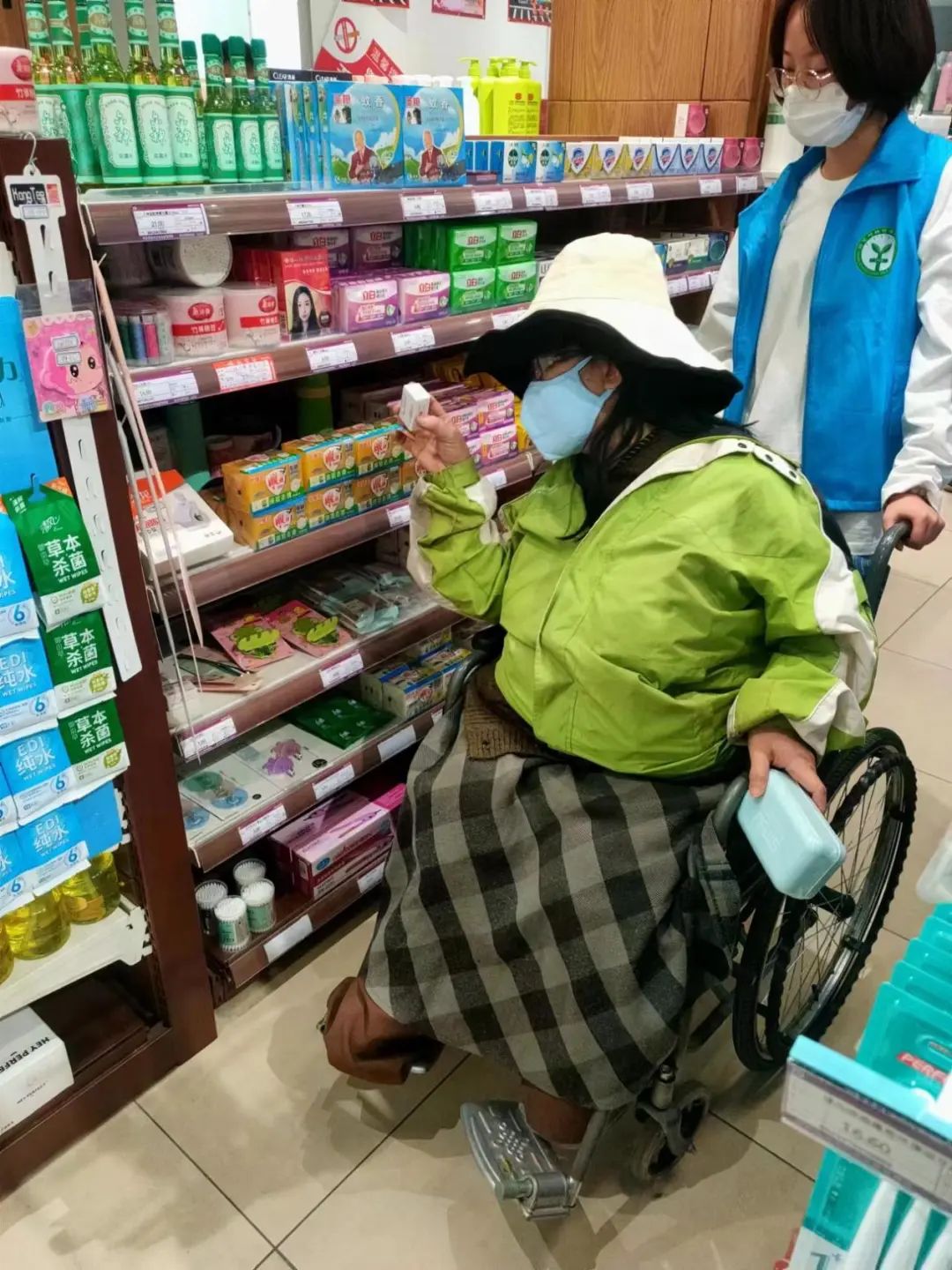 当志愿者们到达叶大姐家时,她已经整装待发。一路上,志愿者们轮流推着叶大姐的轮椅,关切的了解她近期的生活情况和身体状况。来到超市,志愿者们一边推着购物车,一边认真聆听叶大姐的需求,细心地帮叶大姐挑选了一些合适的生活用品。